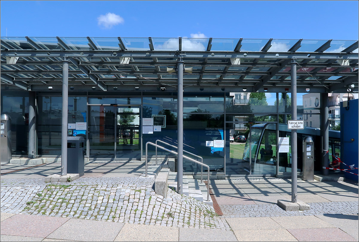Eine Fahrt mit der Bergbahn Künzelsau - Links kommt die Griechisch-orthodoxe Kirche ins Blickfeld während die Brücke auf ihrem letzten Teilstück über die Bundesstraße 19 bis zur Talstation als Fachwerkbrücke ausgebildet ist. 29.07.2021 (M)