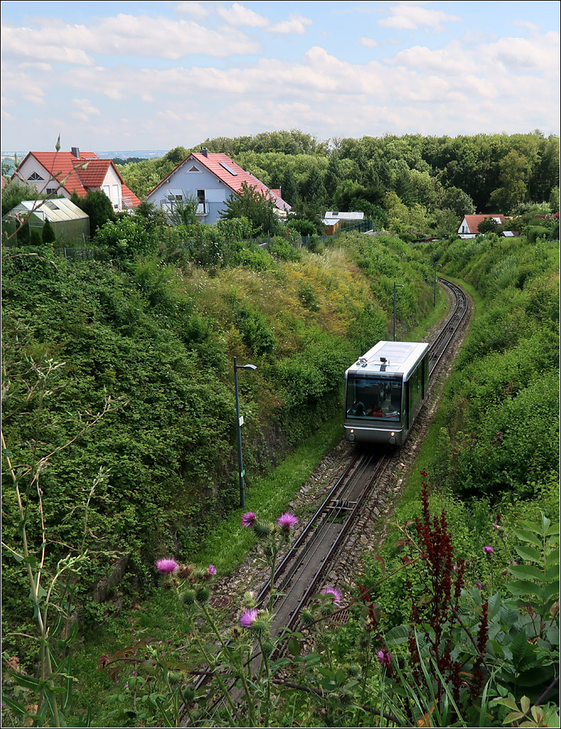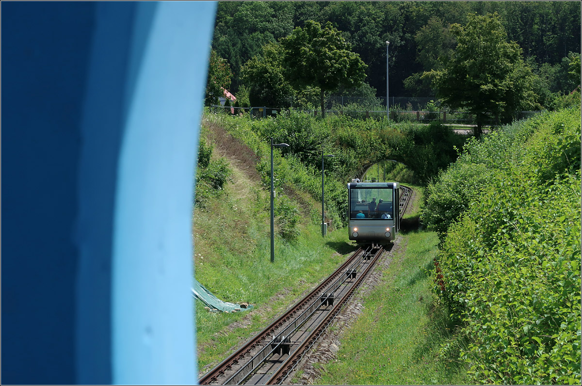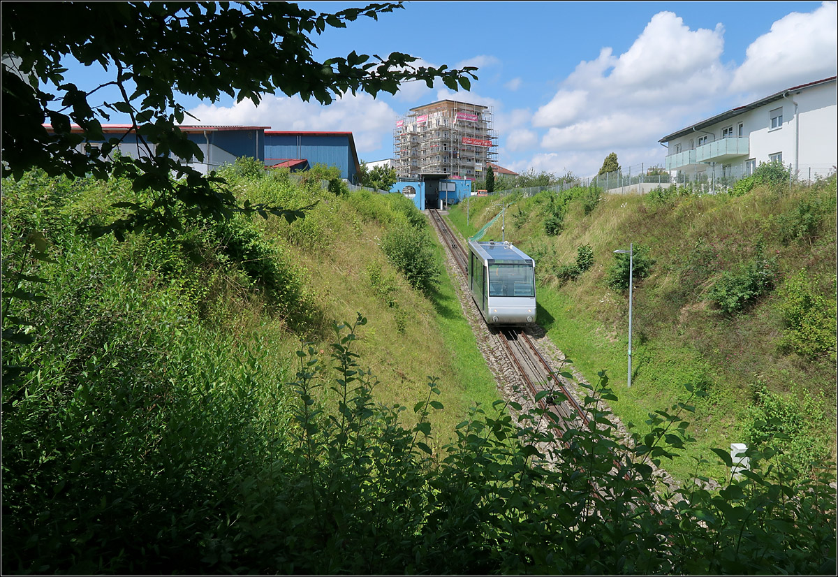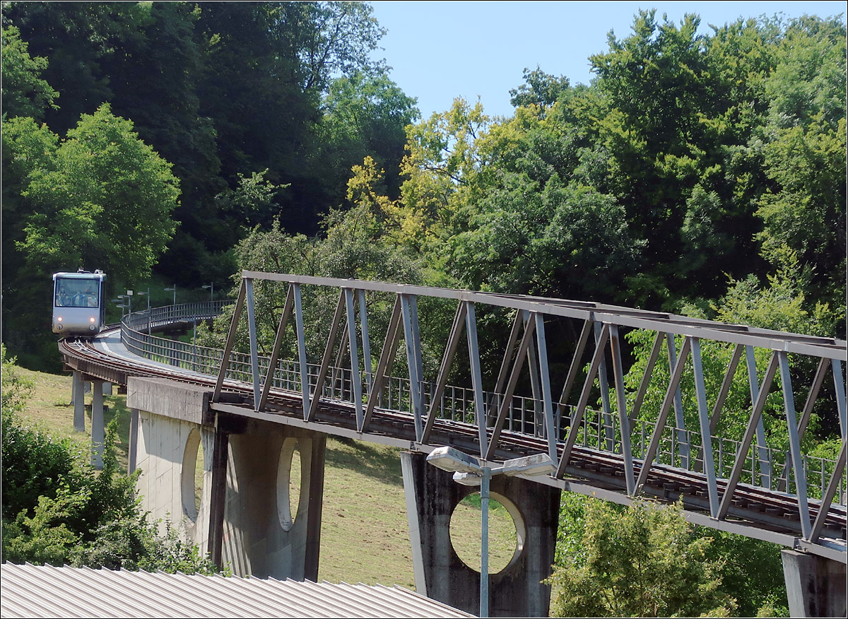 Die Bergbahn Künzelsau - Knapp am Rand entlang ist diese talwärts fahrende Bahn auf der aufgeständerten Strecke kurz vor der Fachwerkbrücke an deren unterem Ende sich die Talstation befindet. 29.07.2021 (M)