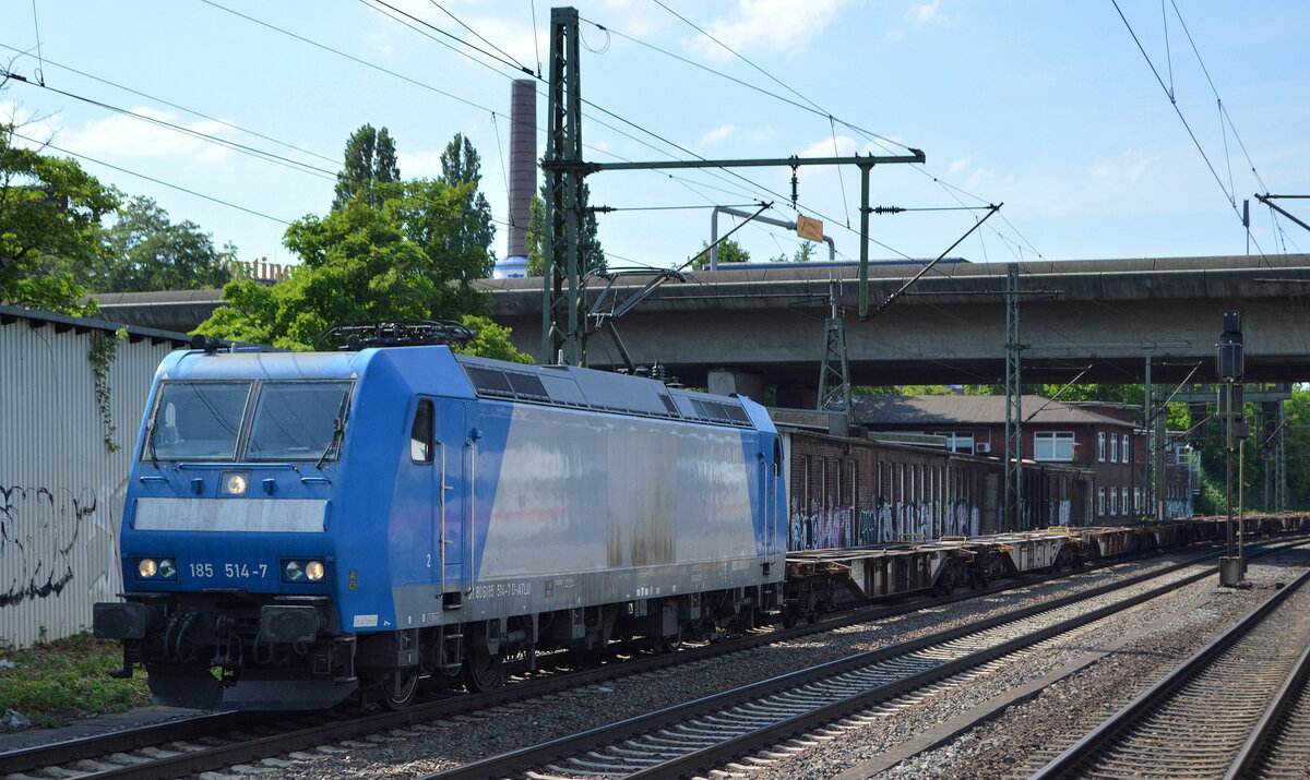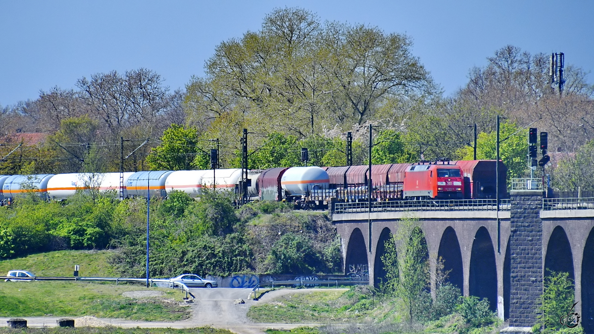 Die Elektrolokomotive 152 060-0 mit einem Güterzug auf dem Weg zur Hochfelder Eisenbahnbrücke in Duisburg. (April 2021)