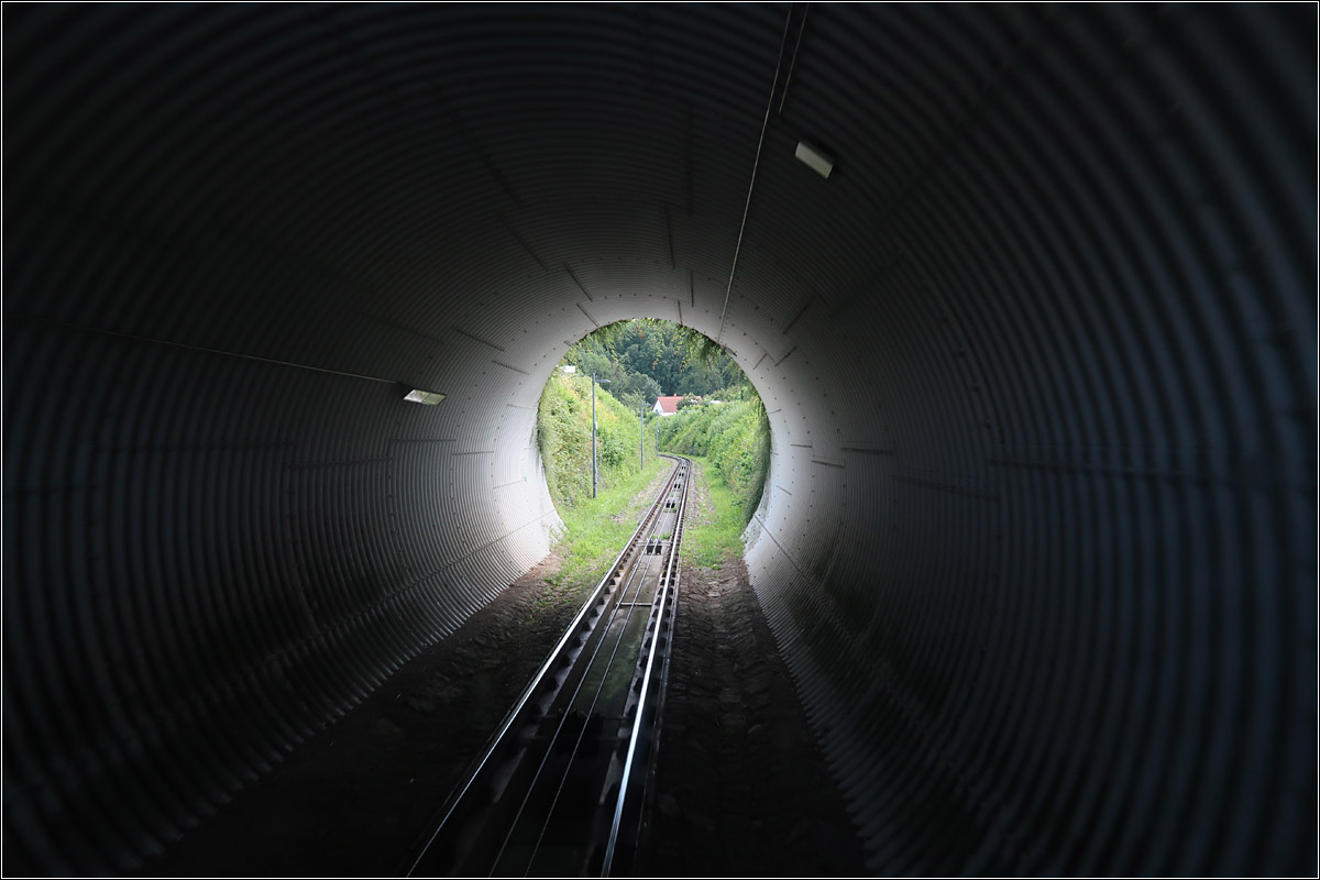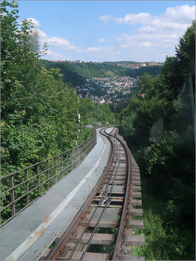 Knapp am Rand entlang ist diese talwärts fahrende Bahn auf der aufgeständerten Strecke kurz vor der Fachwerkbrücke an deren unterem Ende sich die Talstation befindet.