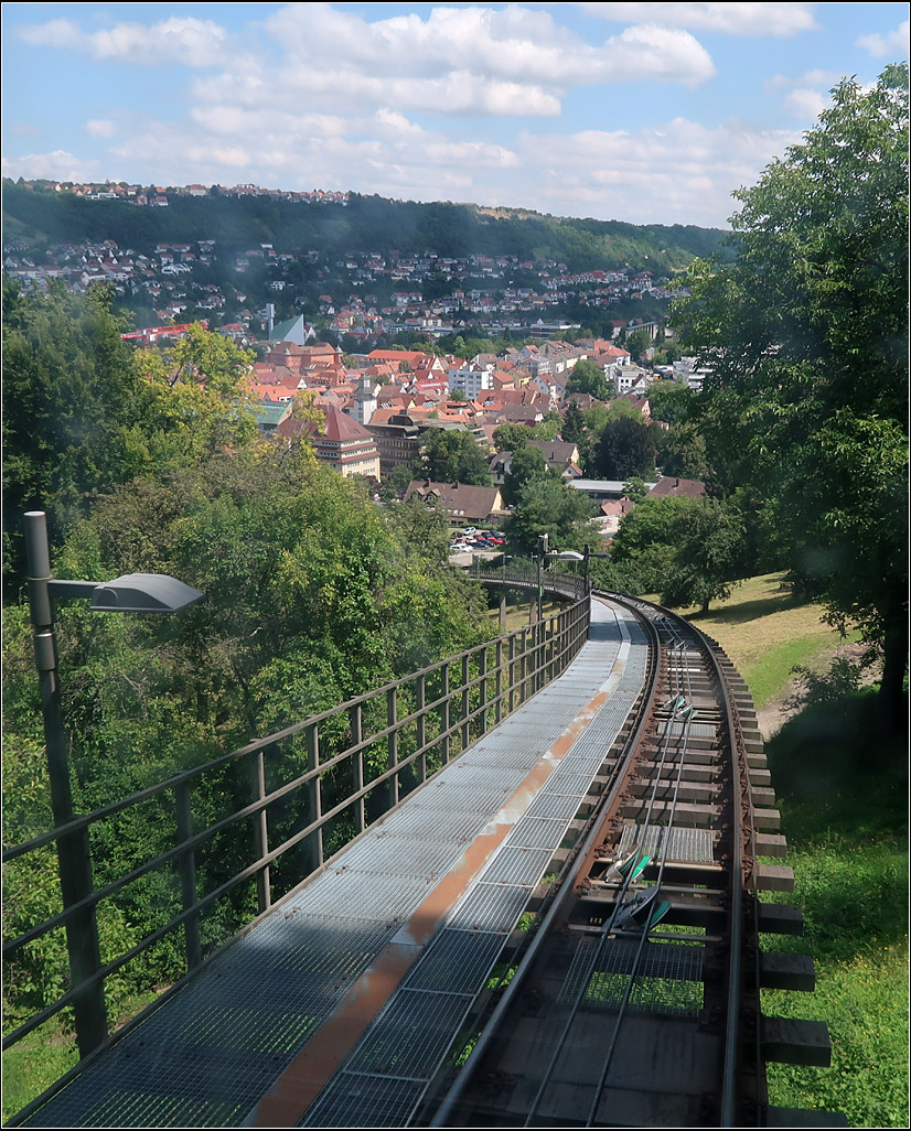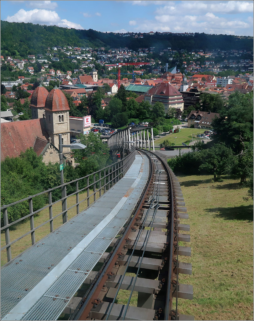 Eine Fahrt mit der Bergbahn Künzelsau - Bevor die Talstation erreicht wird befährt die Bahn eine weitere recht lange Brückenstrecke von der man aus einen schönen Blick auf die Innenstadt von Künzelsau hat. 29.07.2021 (M)