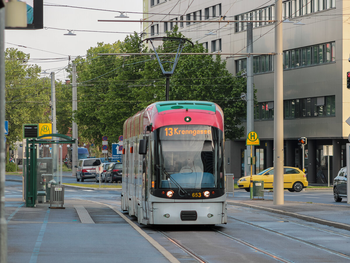 Graz. Cityrunner 653 ist hier am 03.06.2021 als Linie 13 bei der Messe Graz zu sehen.