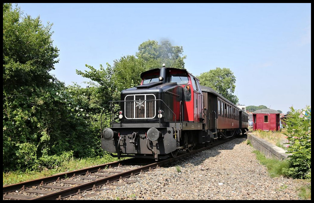 Henschel Stangen Lok 1 war am 25.07.2021 Zuglok für den Museumsbetrieb zwischen Kappeln und Süderbrarup. Hier verläßt die Lok gerade mit zwei gut besetzten Personenwagen um 13.55 Uhr Kappeln an der Schlei in Richtung Süderbrarup.
