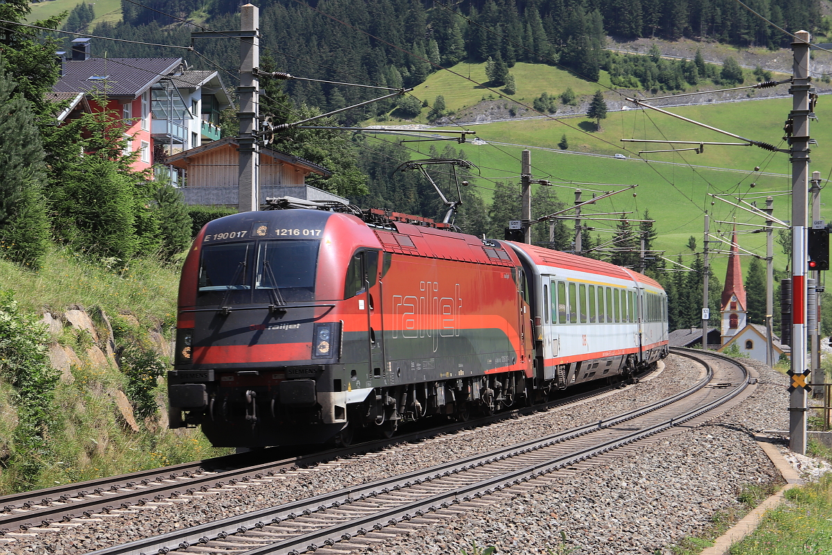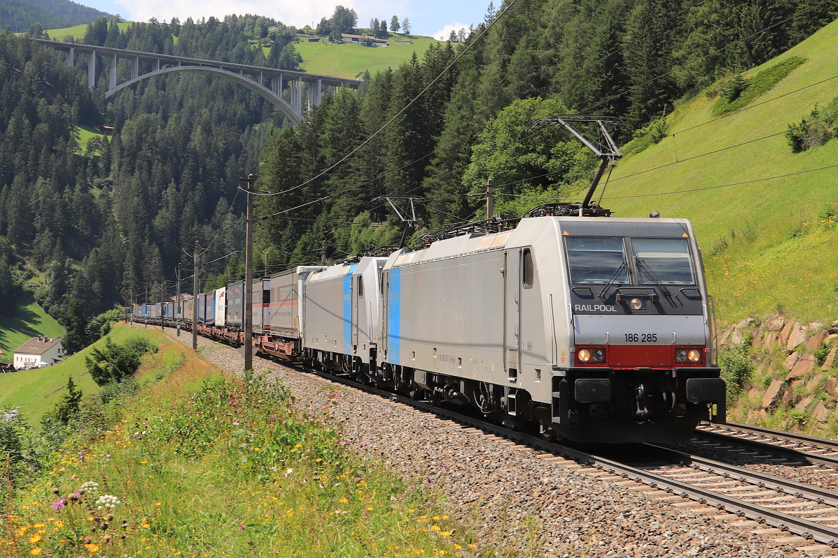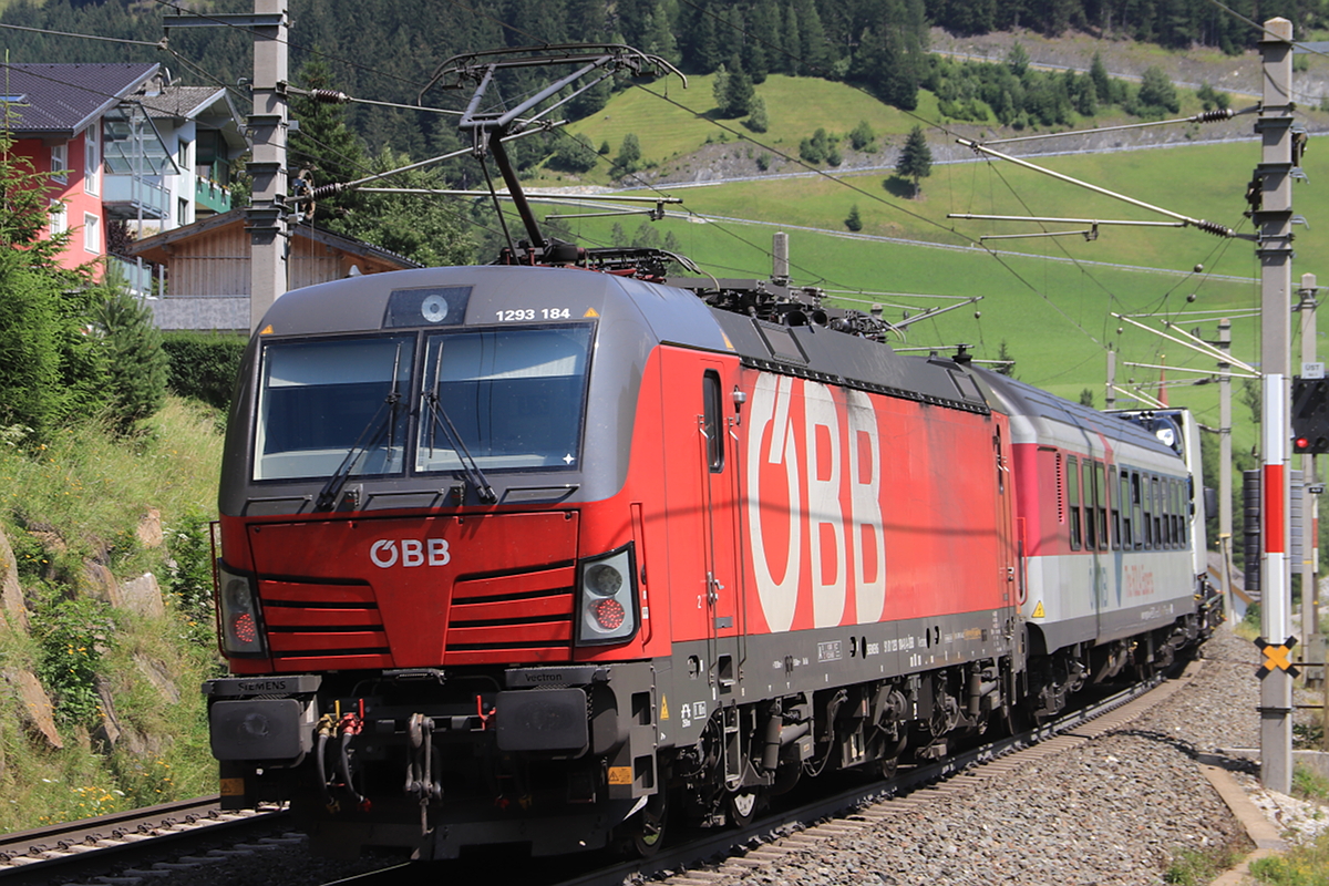 ÖBB 1293 184 als Schubhilfe einer weiteren ROLA von Wörgl Terminal Nord nach Brennersee hier kurz vor dem Bahnhof St. Jodok am Brenner. Aufgenommen am 23.07.2021