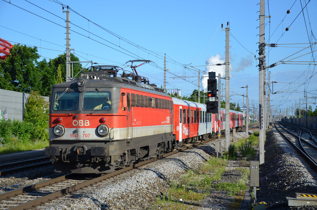 REX5097 von Freilassing nach Salzburg/Hbf. Am 29.07.2021 mit der letztgebauten 1142 707 (Baujahr 1977) bespannt. Aufgenommen bei der Einfahrt in die Haltestelle Salzburg Taxham Europark. Wer genau hinschaut, sieht am rechten Bildrand die Freilassinger Rupertuskirche.