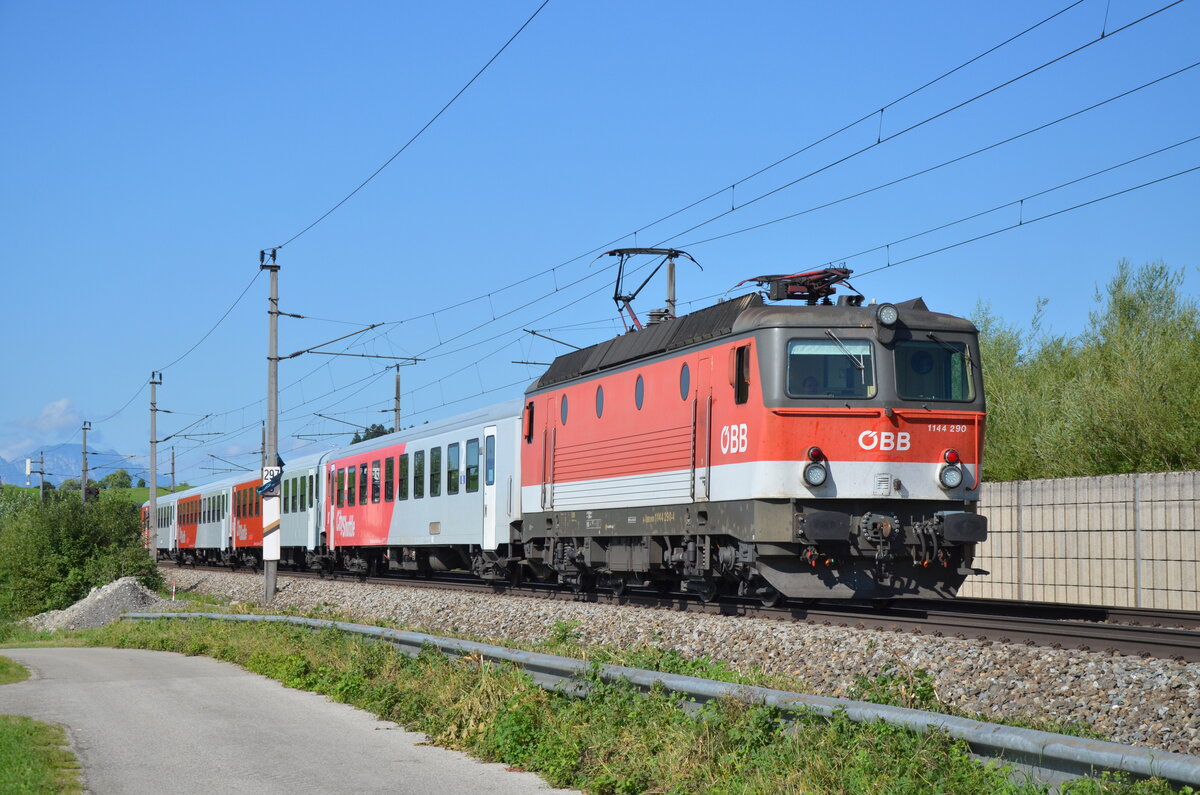 REX5859 von Freilassing nach Neumarkt/Wallersee. Schienenersatzverkehr nach Braunau. Umsteigen auf den Bus ist angesagt derzeit. Die letztgebaute 1044 (1144 290, Abnahme 08/1995) am 29.07.2021 zwischen Seekirchen/Wallersee und Weng.