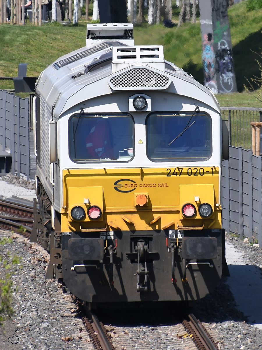 Solofahrt der Diesellokomotive 247 020-1 durch den eingezäunten Gleisbereich um Rheinpark Duisburg-Hochfeld. (April 2021)