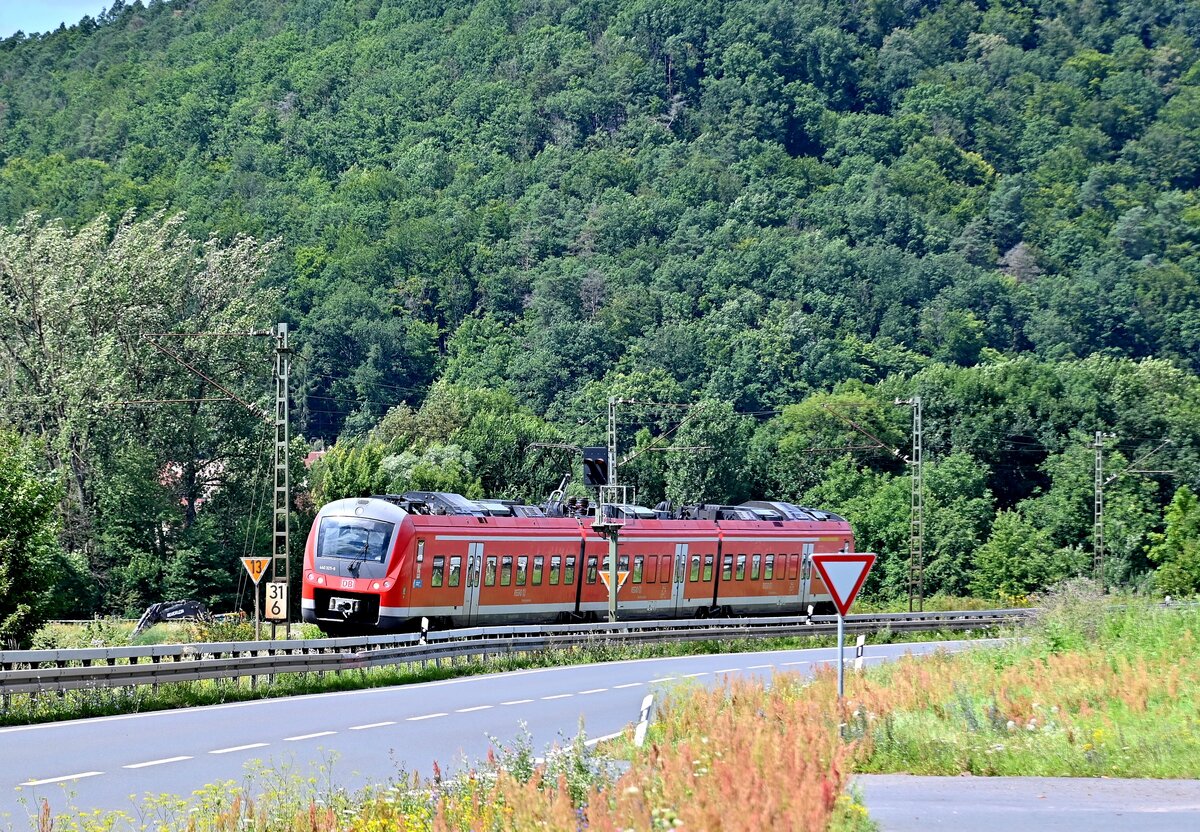 Tele vom Rastplatz aus an der B26 konnte ich den 440 325 gen Würzburg fahrend ablichten zwischen Wernfeld und Karlstadt Gambach. 29.7.2021