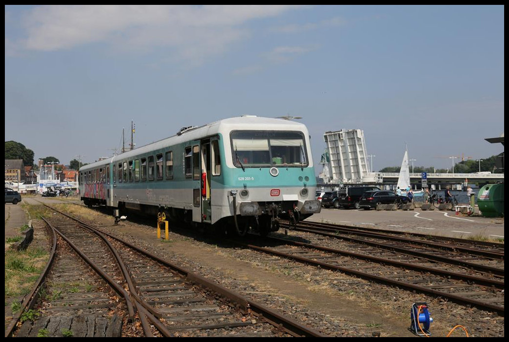 VT 628201-5 wurde am 25.07.2021 für Sonderzugfahrten zwischen Kappeln und Eckernförde genutzt. Hier ist der Zug um 14.00 Uhr gerade aus Eckernförde zurück gekehrt und wartet auf den nächsten Einsatz. Im Hintergrund ist die Klappbrücke über die Schlei gerade geöffnet worden.