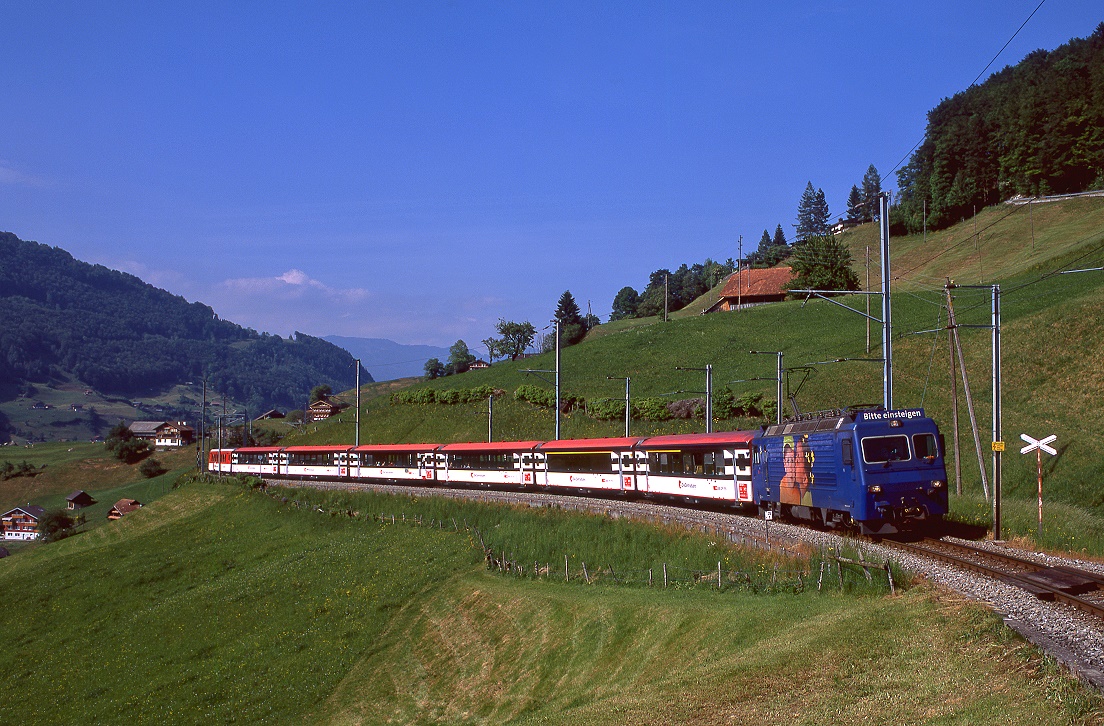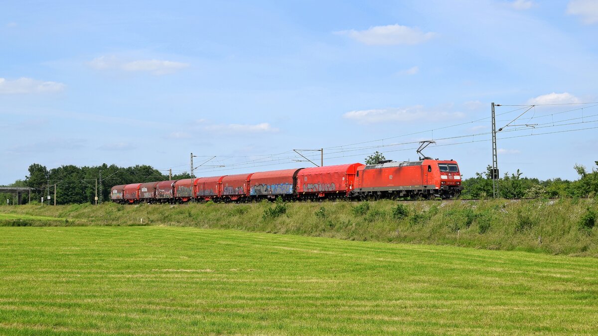 Für Sonntag, 04.07.2021, hatte die Elektrische Zugförderung Württemberg (EZW) über Facebook einen "Fotogüterzug" angekündigt. Die Fahrtroute ging von Regensburg über Nürnberg, Ansbach, Würzburg, Aschaffenburg, Gießen nach Marburg/Lahn. Gegen Mittag konnte das mit etwas mehr als einer Stunde verspätet dahin schleichende Krokodil E94 088 mit seinem Ganzzug leerer Rungenwagen bei Goßmanndorf nahe Ochsenfurt am Main eingefangen werden.