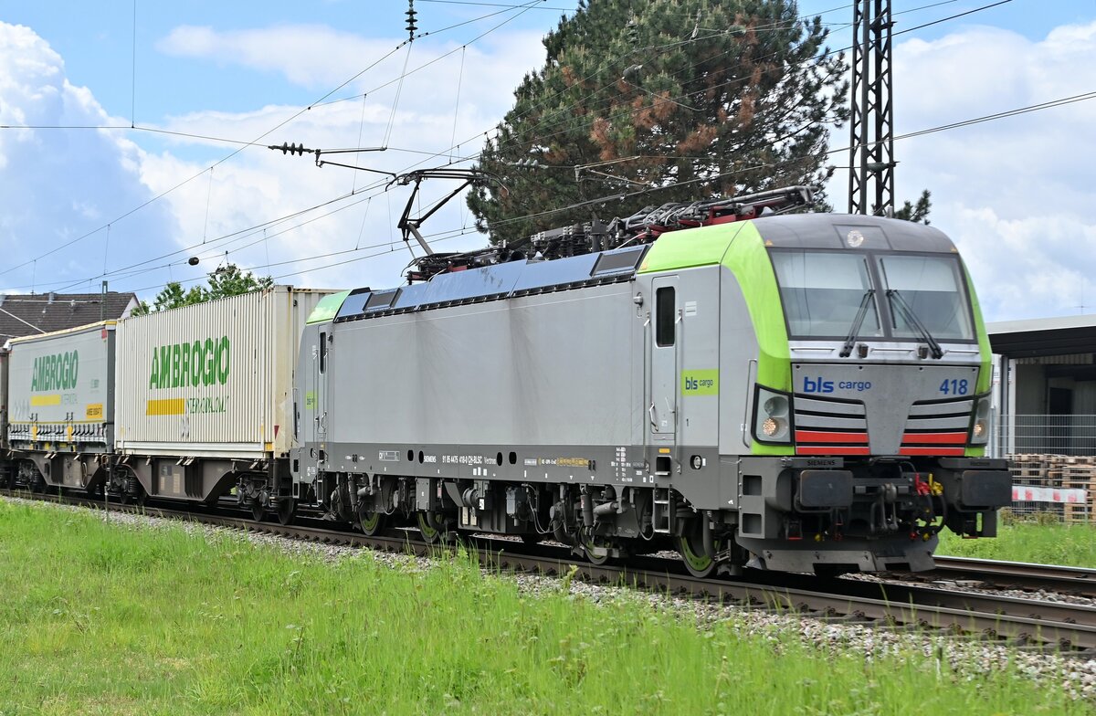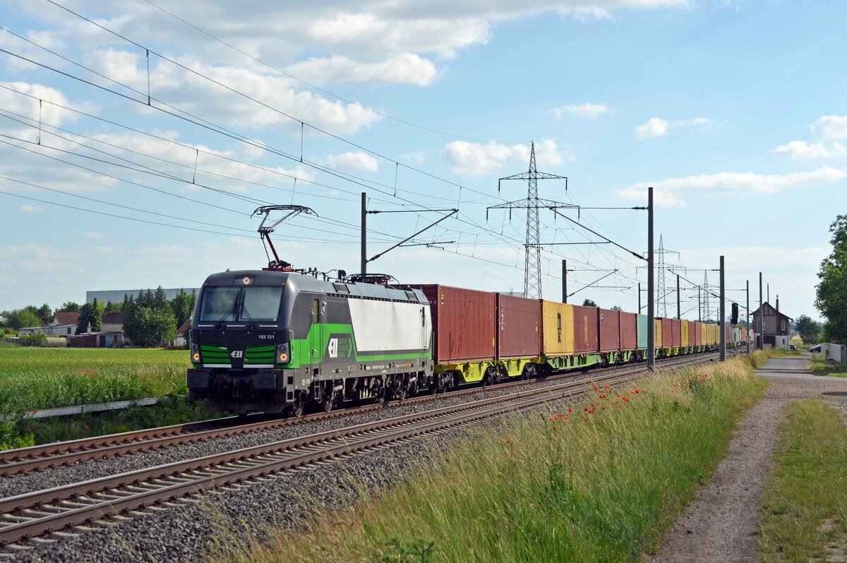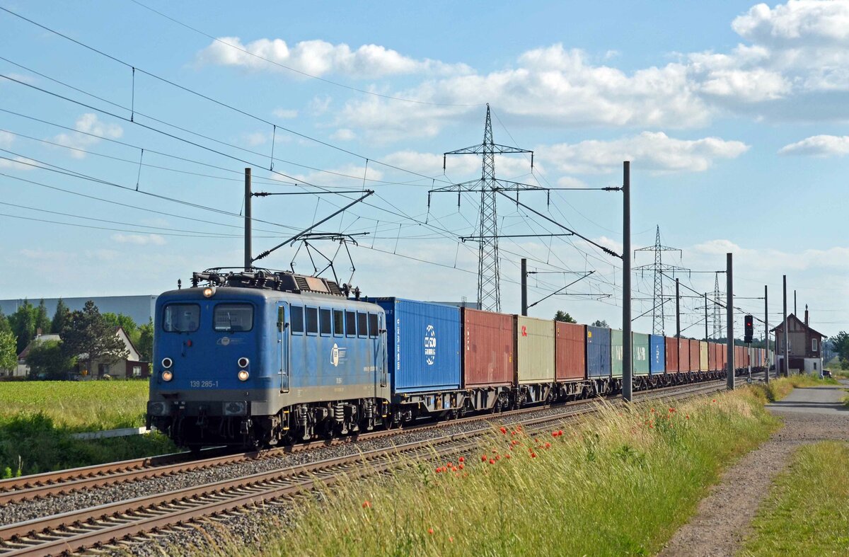 140 002-7 ist am 01.06.2021 mit einen Containerzug bei Braschwitz in Richtung Halle/S. unterwegs.