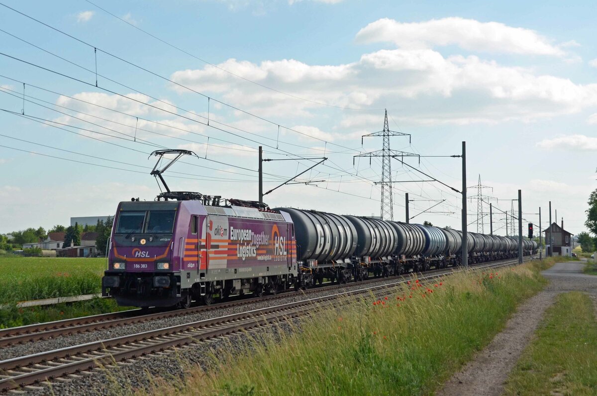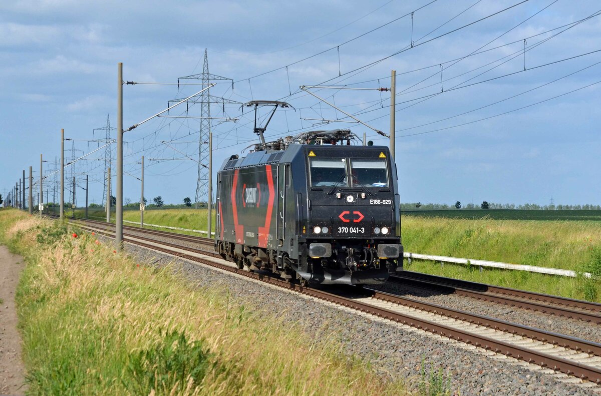 METRANS Rail s.r.o., Praha [CZ] mit der Akiem Mietlok "186 369-5" [NVR-Nummer: 91 80 6186 369-5 D-AKIEM] und Containerzug am 11.05.21 Durchfahrt Bf. Saarmund.