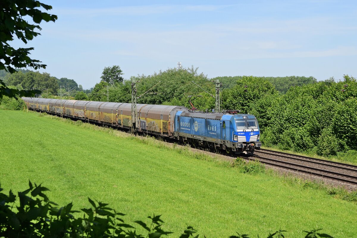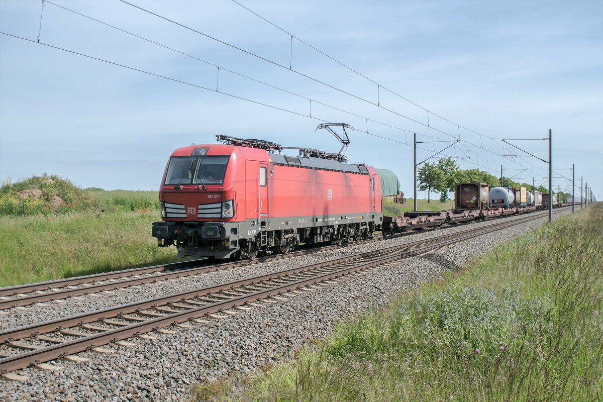 193 377-9 zu sehen mit einen Aufliegerzug am 01.06.2021 bei Braschwitz.