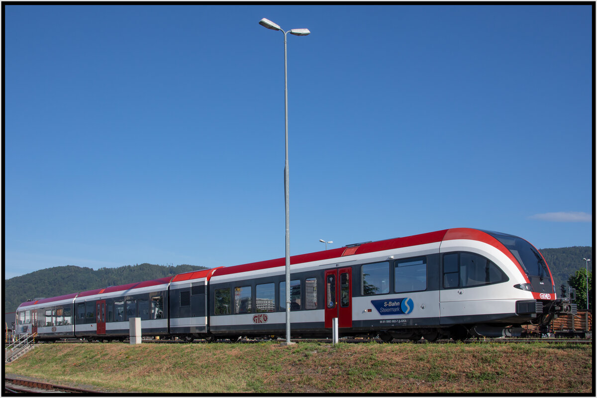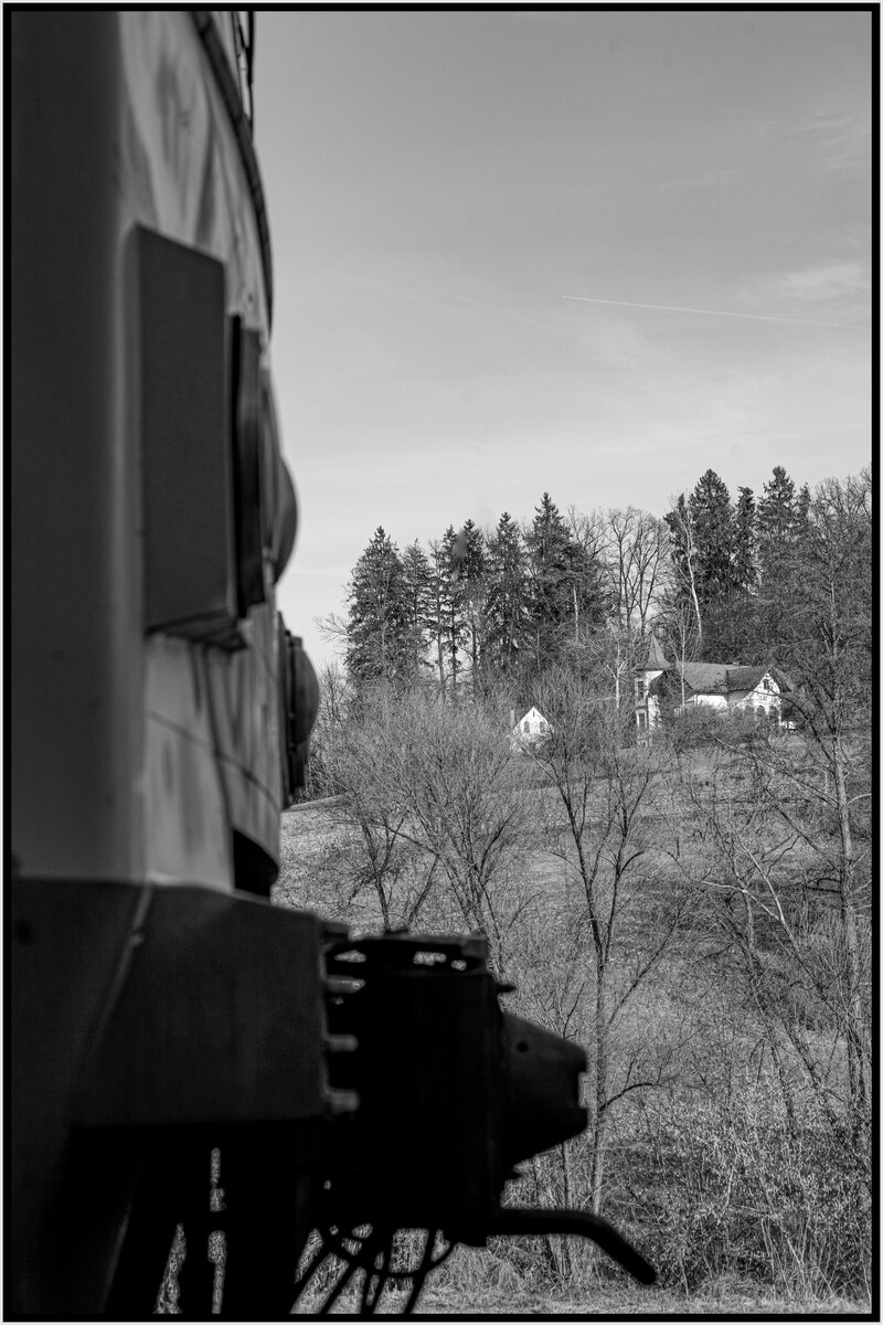 Die Stelle hab ich eigentlich bei einer Radltour entdeckt, daher lag es nahe, nach einem Regen, wenn die Sicht schön klar ist, dort schnell mit dem Radl hin zu fahren, abzudrücken, und 7 Minuten später wieder zu Hause zu sein. Freitag am Abend war es dann soweit. GKB 1500.X mit dem geschobenen 8569 von Graz über Lieboch nach Wies-Eibiswald am 2.7.2021 zwischen Hollenegg und Schwanberg mit Blick auf den Demmerkogel.