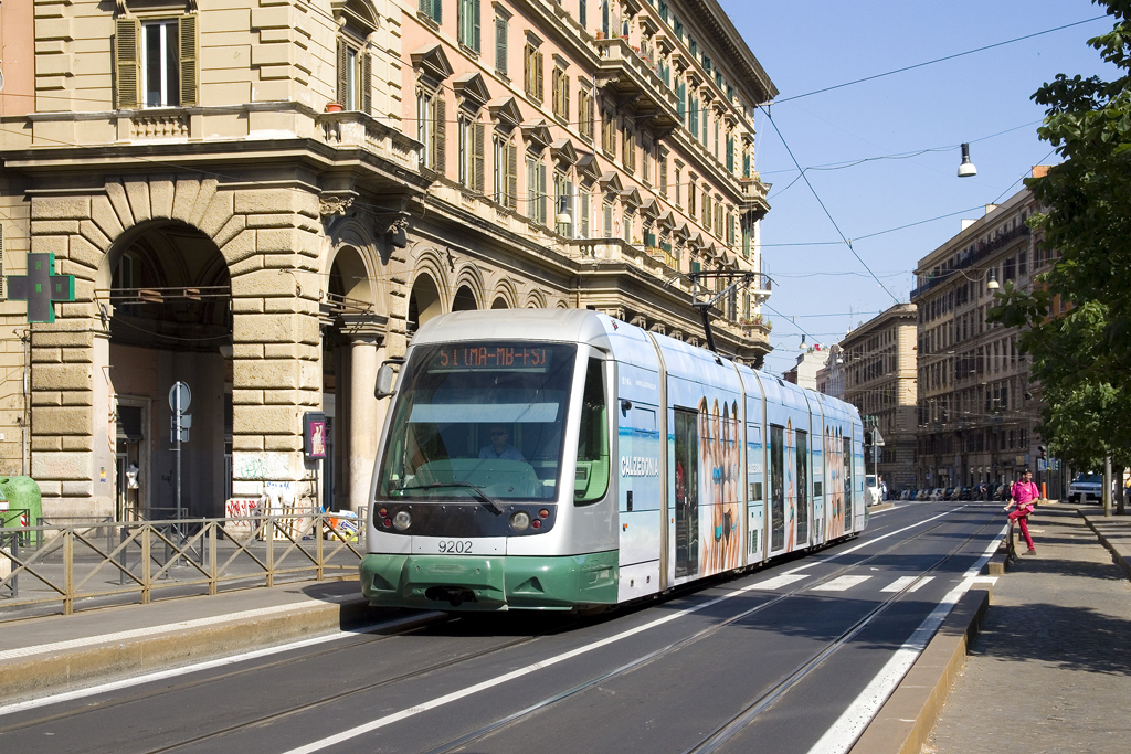 Am 31. Mai 2017 ist TW 9202 als Linie 5 in Richtung Stazione Termini unterwegs und ist hier am Piazza Vittorio Emanuele II zu sehen.