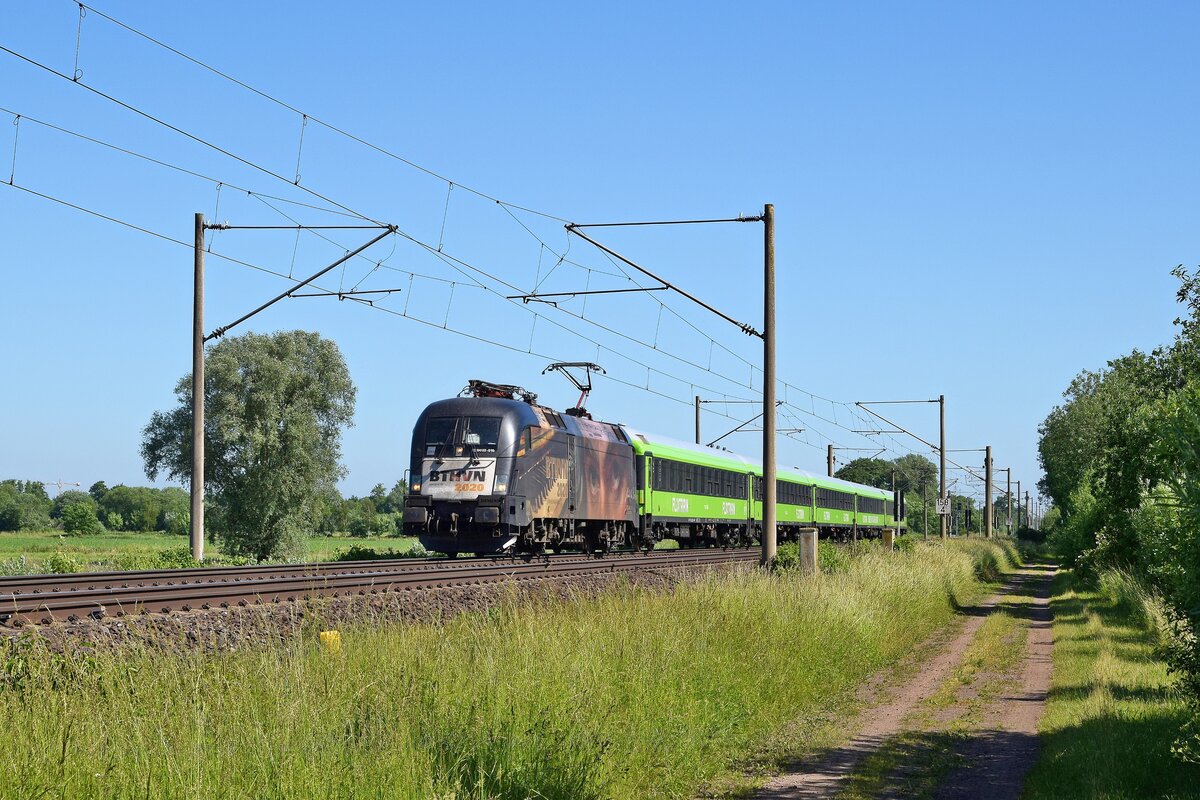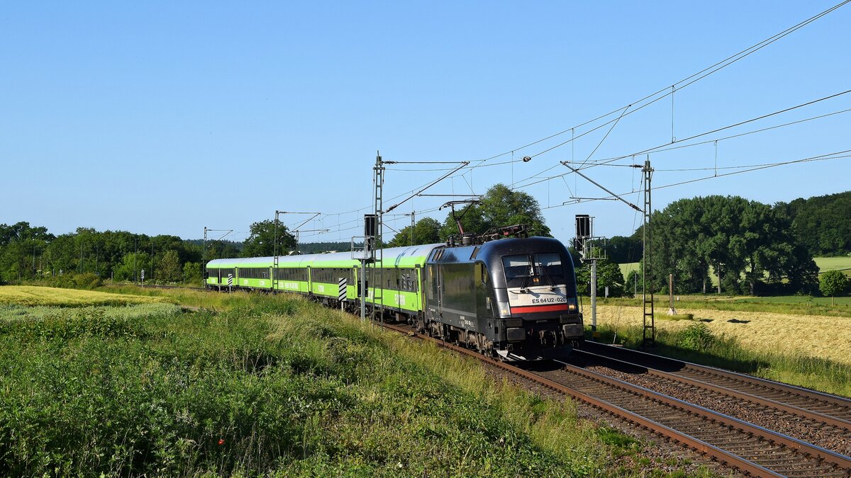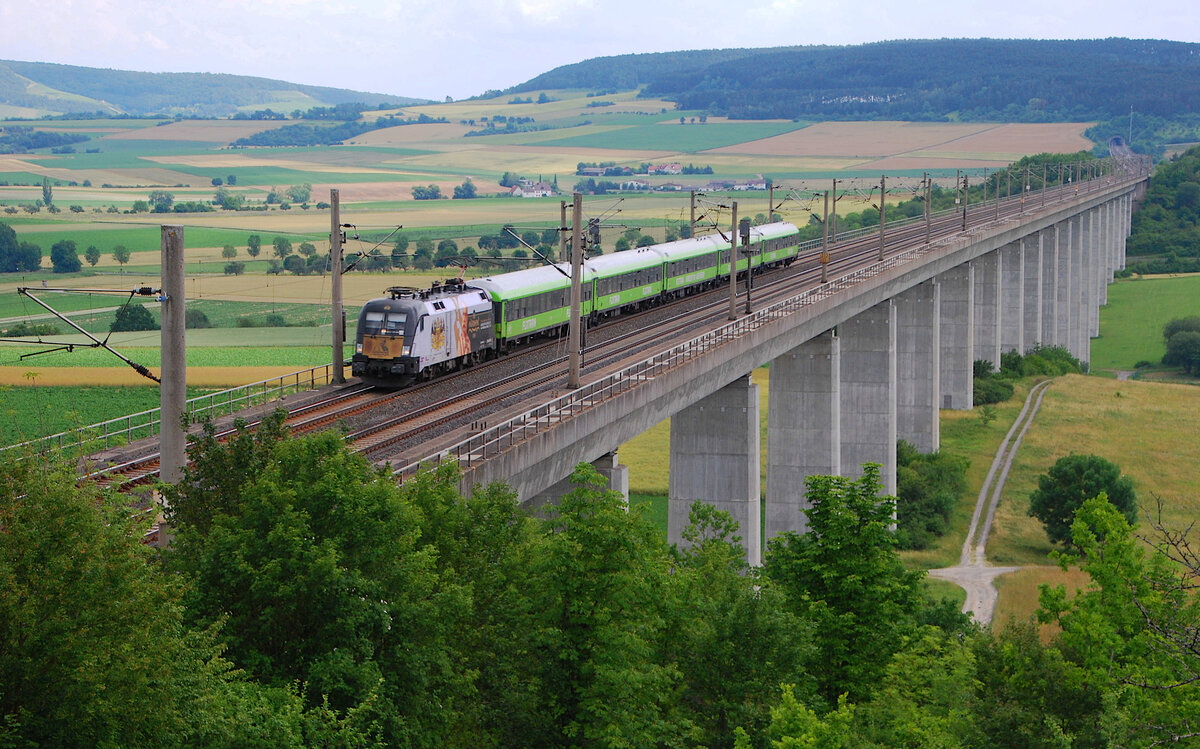 Am frühen Nachmittag des 04. juli 2021 konnte pünktlich der schnelle  Kaiser  (182 523-1) mit dem Flixtrain FLX76336 von München nach Frankfurt/Main Süd über die Schnellfahrstrecke bei Leinach flüchtend fotografiert werden.