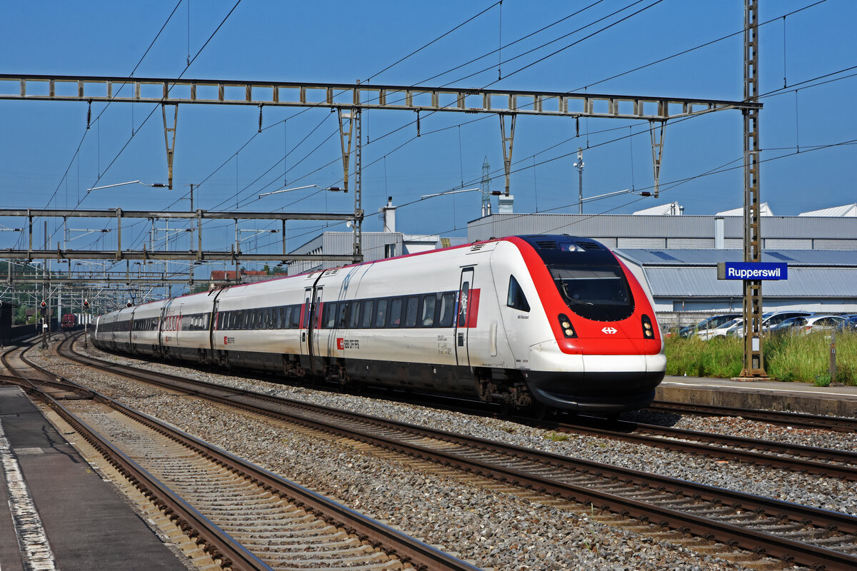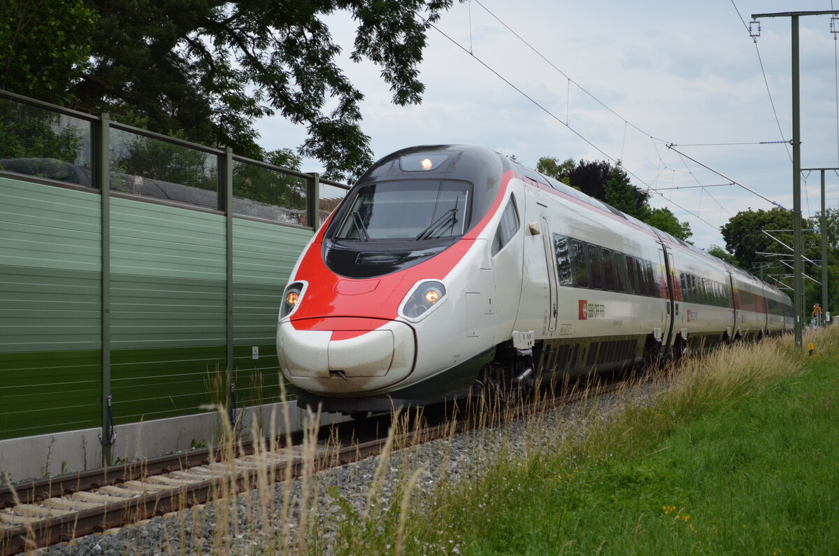 Der SBB ICN 500 035 "Niklaus Riggenbach" ist als IR51 1614 auf dem 285 Meter langen Mösli Viadukt kurz nach der Abfahrt in Grenchen Nord auf dem Weg nach Biel/Bienne. 4. Juli 2021