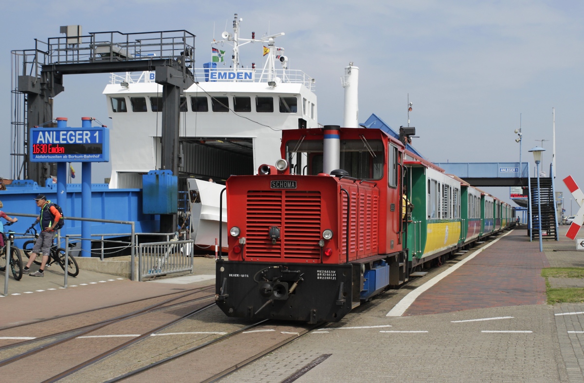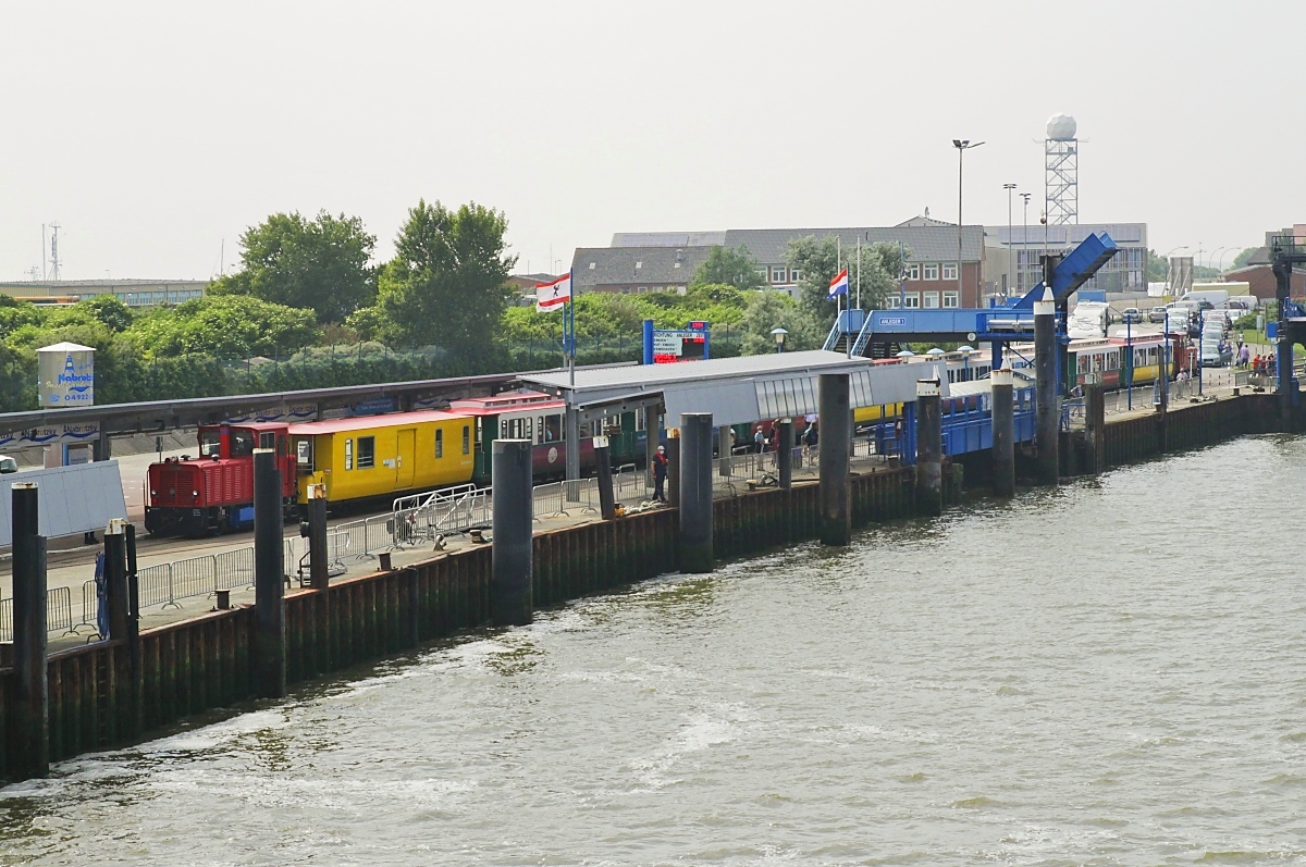 Blick von der einlaufenden AG Ems-Fähre  Ostfriesland  auf den in Borkum Reede auf die Urlauber wartenden Zug der Borkumer Kleinbahn mit der Schöma-Lok  Hannover  am Zugende (26.06.2021)