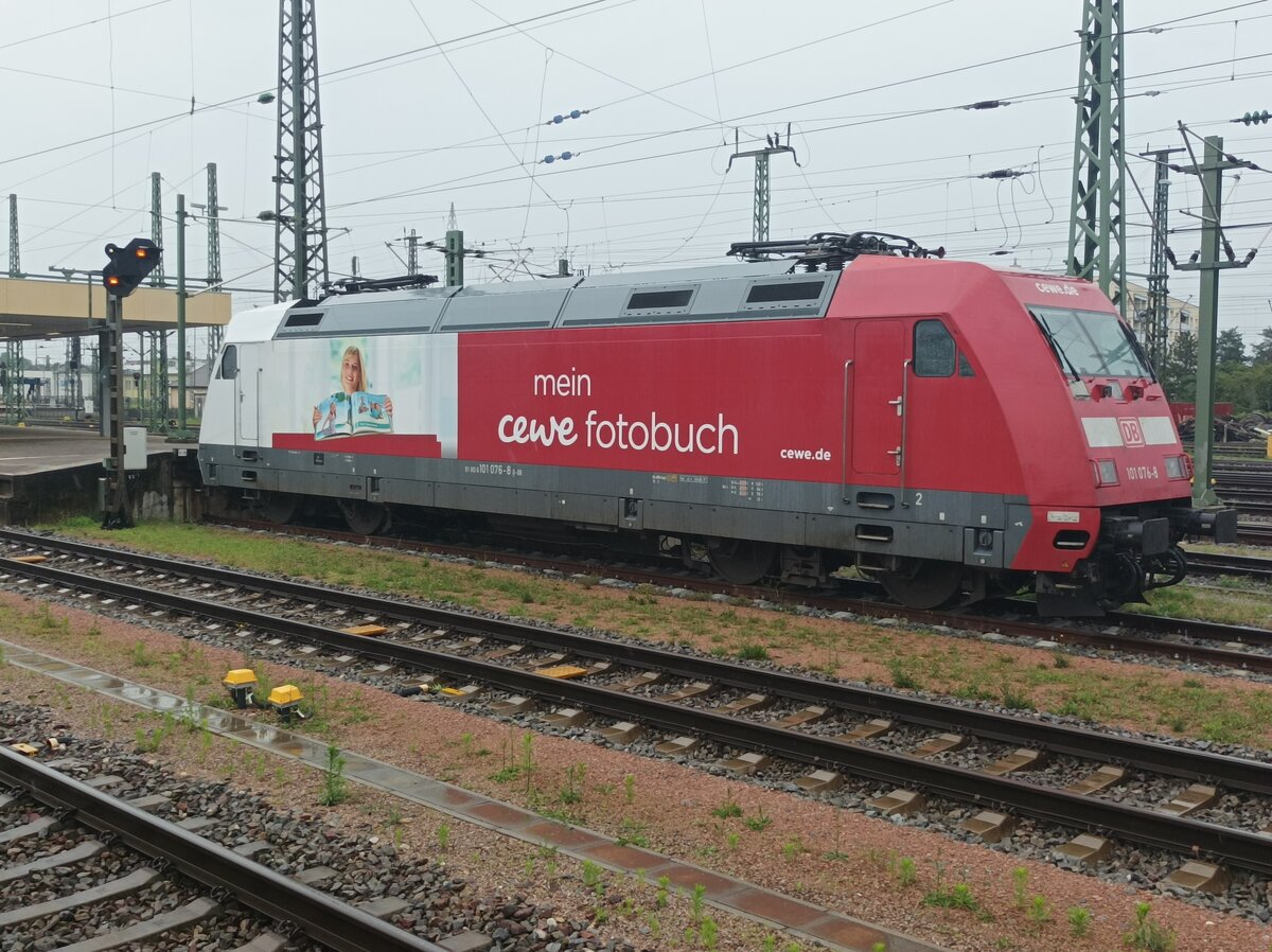 Breitseite auf die blau-beige 111 001-4, die den Museumszug vom DB Museum Koblenz zum DB Museum Halle (Saale) durch Braschwitz führt.