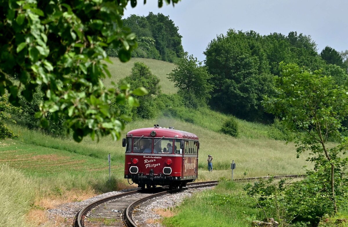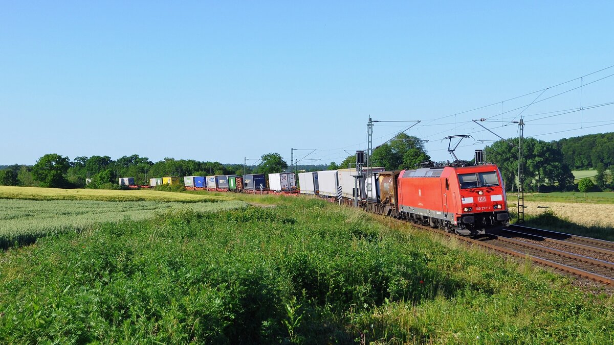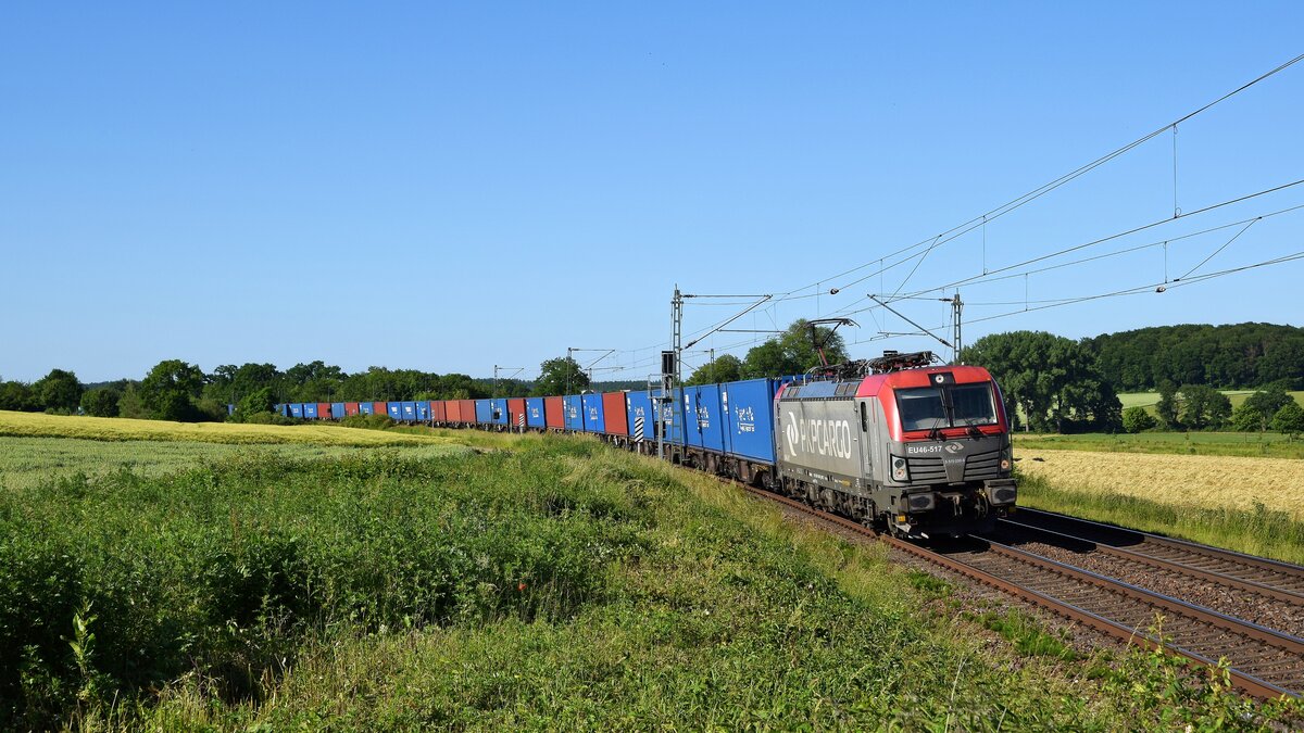 Für Sonntag, 04.07.2021, hatte die Elektrische Zugförderung Württemberg (EZW) über Facebook einen  Fotogüterzug  angekündigt. Die Fahrtroute ging von Regensburg über Nürnberg, Ansbach, Würzburg, Aschaffenburg, Gießen nach Marburg/Lahn. Gegen Mittag konnte das mit etwas mehr als einer Stunde verspätet dahin schleichende Krokodil E94 088 mit seinem Ganzzug leerer Rungenwagen bei Goßmanndorf nahe Ochsenfurt am Main eingefangen werden.