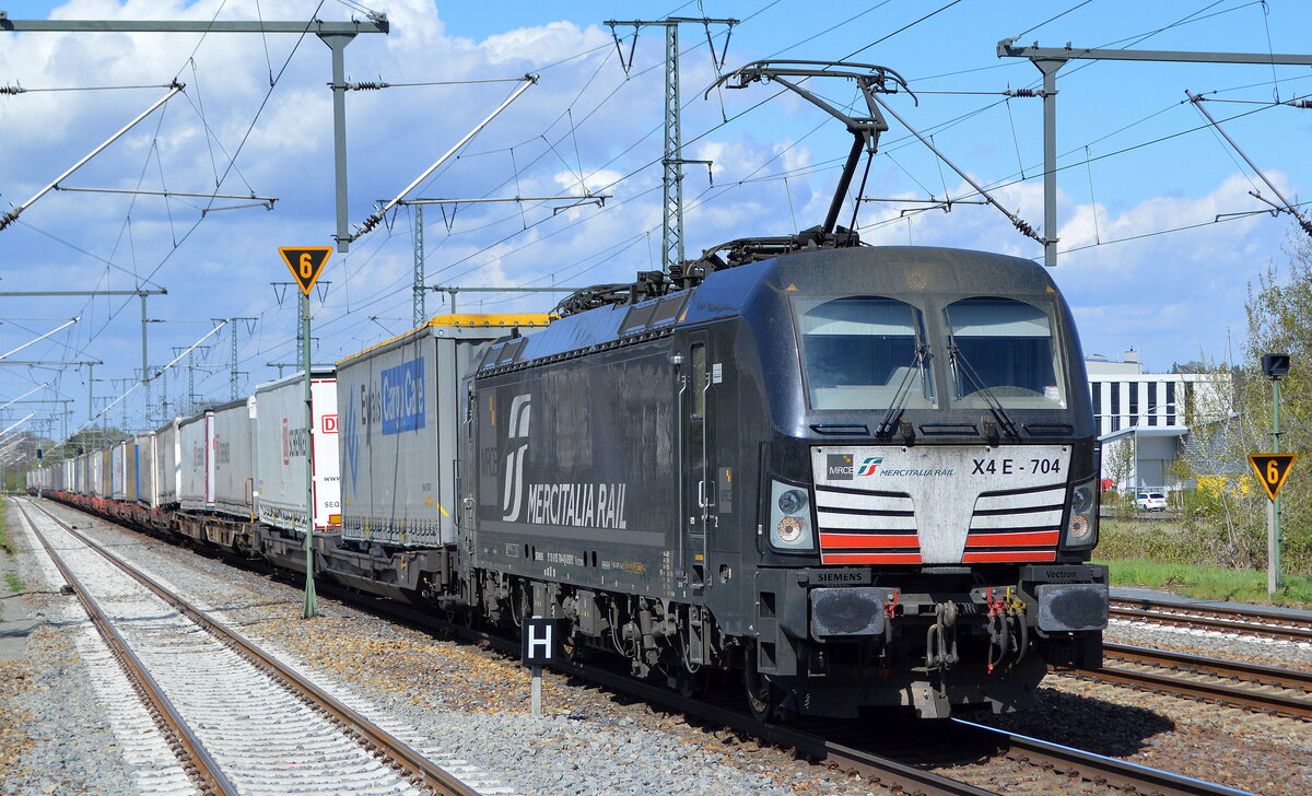 DB Cargo AG [D]/ Mercitalia Rail S.r.l., Roma [I] mit der MRCE Vectron "X4 E - 707" [NVR-Nummer: 91 80 6193 707-7 D-DISPO] und Taschenwagenzug am 11.05.21 Durchfahrt Bf. Saarmund.