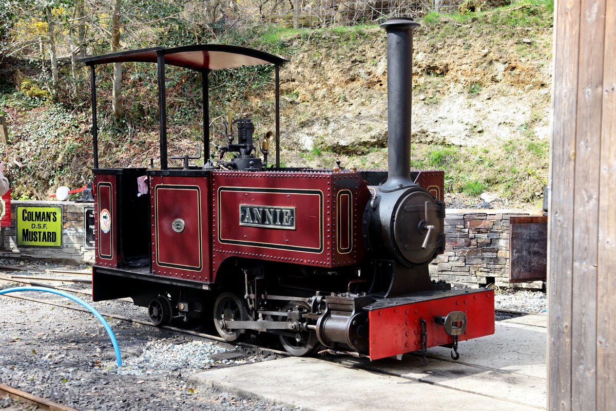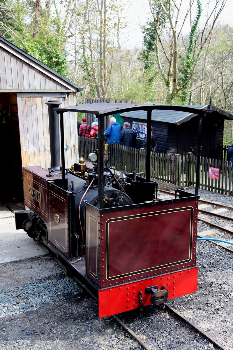 Die ursprünglich für unseren Zug vorgesehen Lok ANNIE steht vor dem Lokschuppen in der Station Lhen Coan, am 28.04.2018. Leider war sie nicht einsatzbereit. Sie wurde 1998, unter der Fabr.-Nr. 1922 von W.G.Bagnall Engineers in Stafford, Engl. gebaut und ist eine Nachbau einer Lok aus dem Jahr 1911.