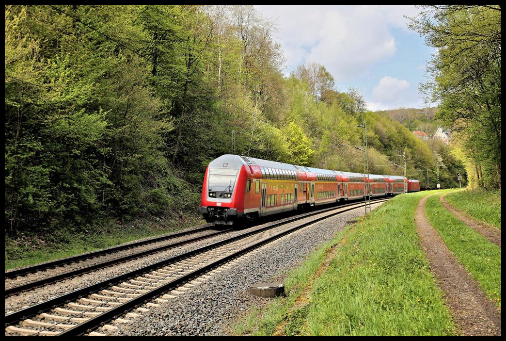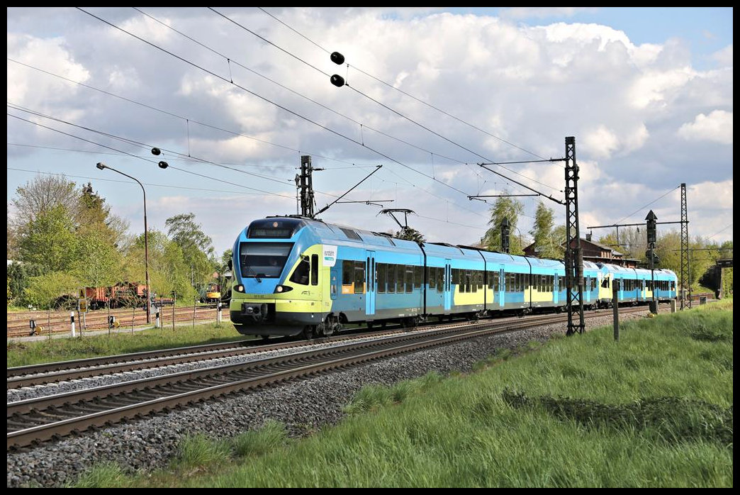 Die Eurobahn in Form des ET 9.02 erreicht hier am 7.5.2021 um 16.29 Uhr als RB 66 aus Münster kommend den Stadtrand von Lengerich in Westfalen.