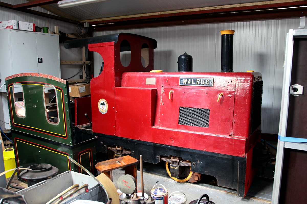 Die WALRUS in der Fahrzeughalle der GGR, in der Sation Lhen Coan, am 28.04.2018. Sie wurde 1952 von Hunslet gebaut für eine Kiesgrube in Twickenham (Greater London), seit 1982 ist sie auf der Isle of Man.