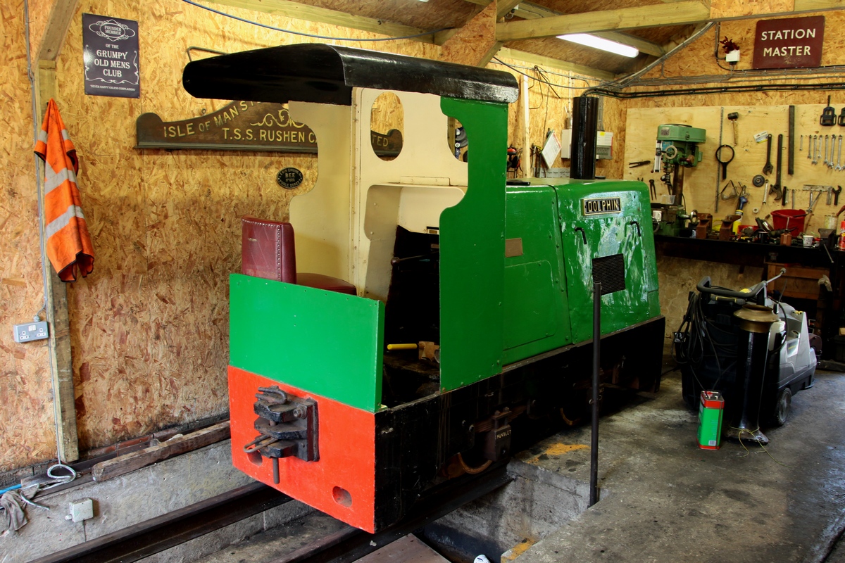 Diesellok DOLPHIN im Lokschuppen der GGR, in der Station Lhen Coan, am 28.04.2018. Gebaut bei Hunslet Engine Company 1952, sie war bei einer Kiesgrube in Twickenham (Greater London) im Einsatz und kam 1982 auf die Isle of Man.
