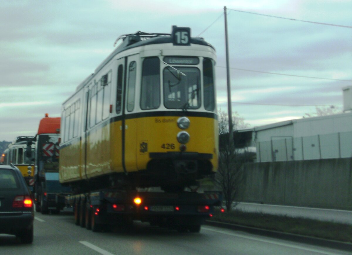 Hier: Transport der GT4 451 und GT4 426 auf Schwertransportern. Der Weg führt vom Straßenbahndepot Bad Cannstatt auf der B10 nach Stuttgart-Wangen. Dort werden die GT4 auf Güterwagen verladen, um diese nach Rumänien zu verbringen.