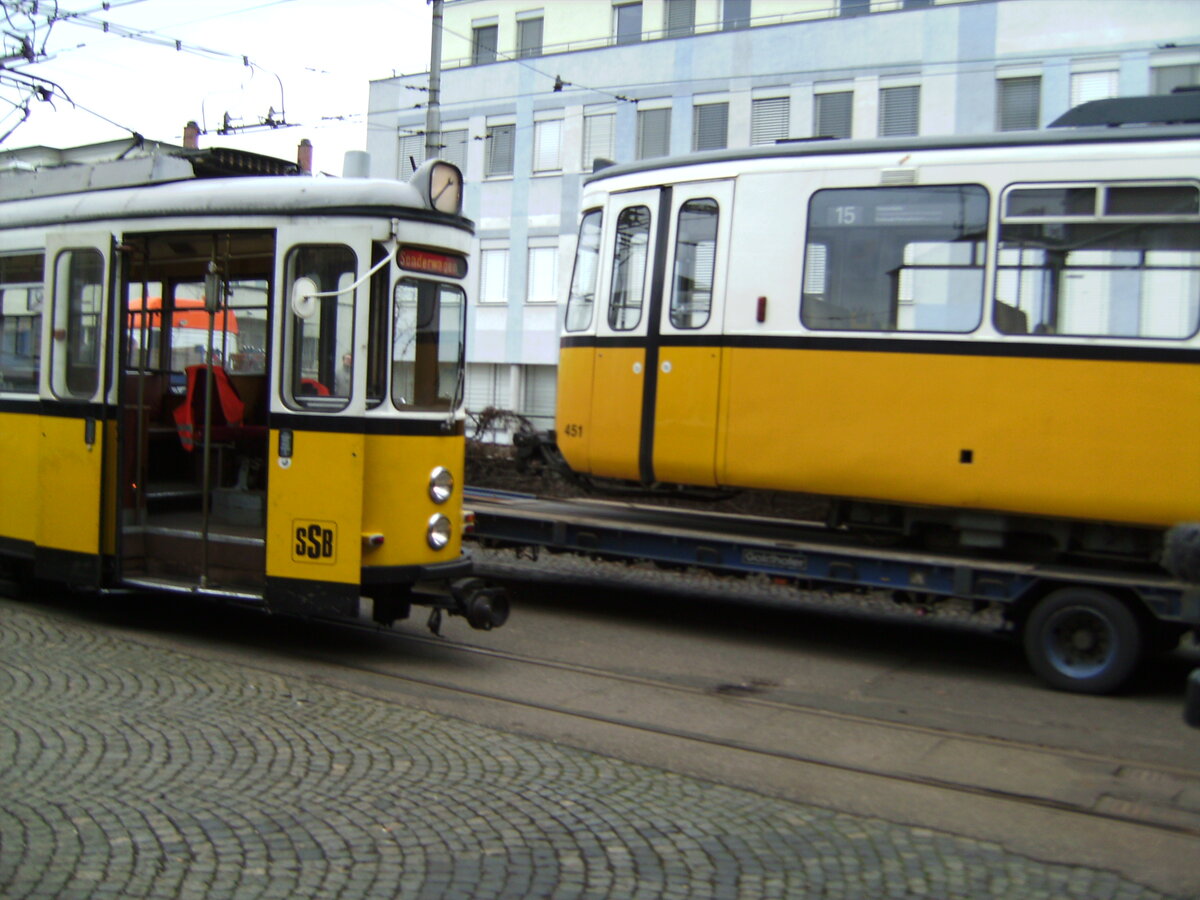 Hier: Verladung des GT4 451 auf einen Schwertransporter im Depot Bad Cannstatt. Zur Unterstützung beim Rangieren hilft DoT4 2041 (ex 914).
