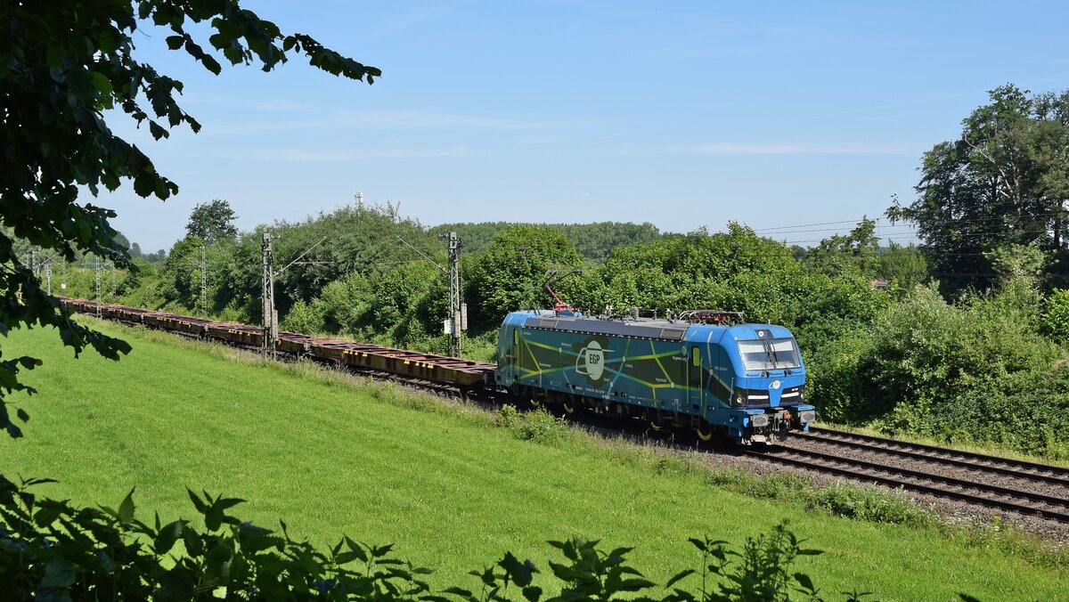 Die EGP 192101 erreicht hier am 7.5.2021 um 15.49 Uhr mit einem Containerzug in Richtung Osnabrück fahrend den Stadtrand von Lengerich in Westfalen.