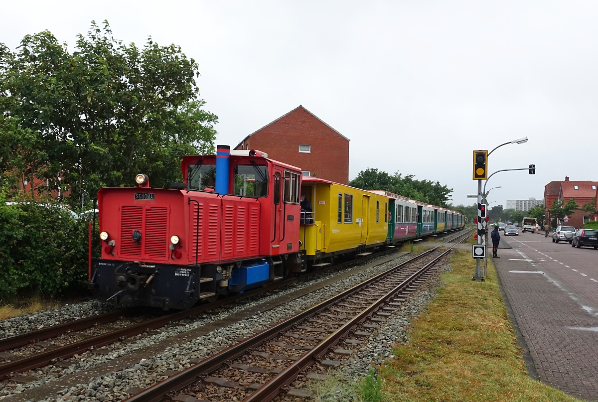 Entlang der Deichstraße bringt die Lok "Aurich" der Borkumer Kleinbahn am 30.06.2021 Urlauber vom Kleinbahnhof zur Reede