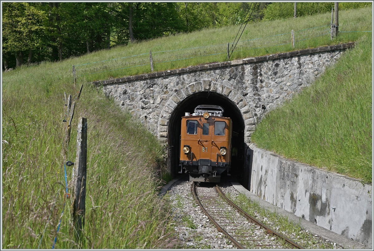 Re 421 373 mit Tm und leeren Holzwagen anlässlich eineim Zwischenhalt in St. Ursanne am 2. Juni 2021.