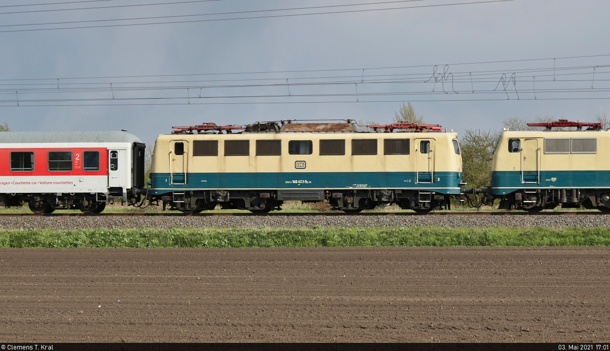[Reupload] Blick auf 140 423-5, die in der Überführungsfahrt des DB Museums Koblenz zum DB Museum Halle (Saale) eingereiht ist und von 111 001-4 durch Braschwitz gezogen wird. 🧰 DB Museum Nürnberg (Standort Koblenz) 🚝 Lr 91340 Koblenz-Lützel–Halle (Saale) 🚩 Bahnstrecke Magdeburg–Leipzig (KBS 340) 🕓 3.5.2021 | 17:01 Uhr