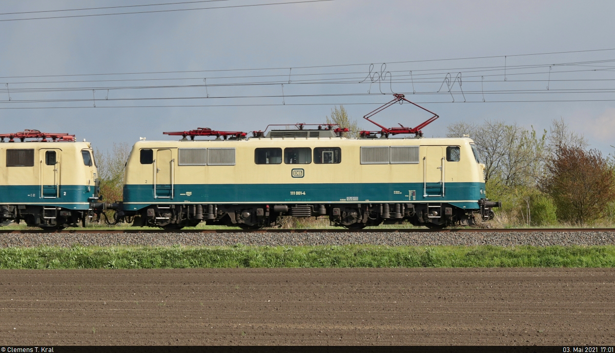 [Reupload] Breitseite auf die blau-beige 111 001-4, die den Museumszug vom DB Museum Koblenz zum DB Museum Halle (Saale) durch Braschwitz führt. 🧰 DB Museum Nürnberg (Standort Koblenz) 🚝 Lr 91340 Koblenz-Lützel–Halle (Saale) 🚩 Bahnstrecke Magdeburg–Leipzig (KBS 340) 🕓 3.5.2021 | 17:01 Uhr