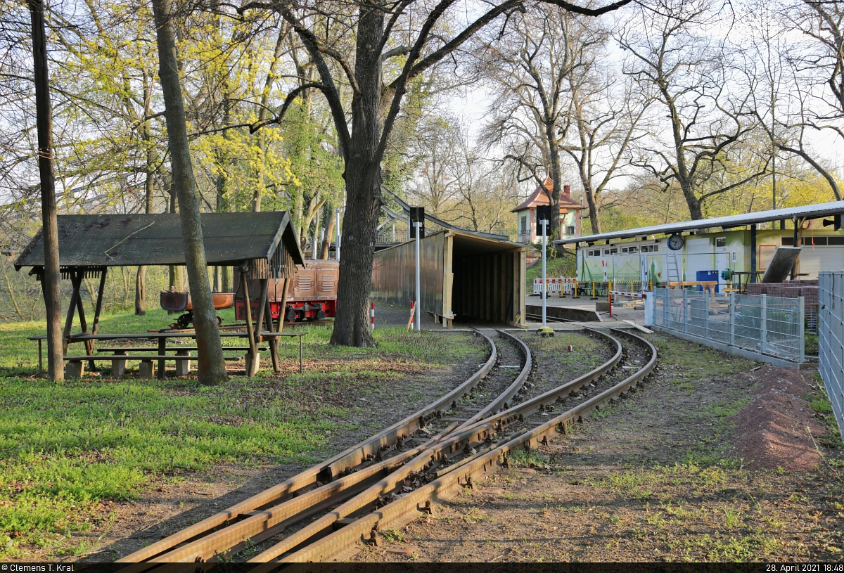Die Akkulok POLAR BEAR steht am 28.04.2018 in der Station Lhen Coan vor dem Lokschuppen. Diese Lok ist ein Nachbau aus dem Jahr 2003 von Alain Keef, Vorbild für den Nachbau waren 2 Akkuloks, die von 1921 bis 1926 bei der GGR im Einsatz standen.