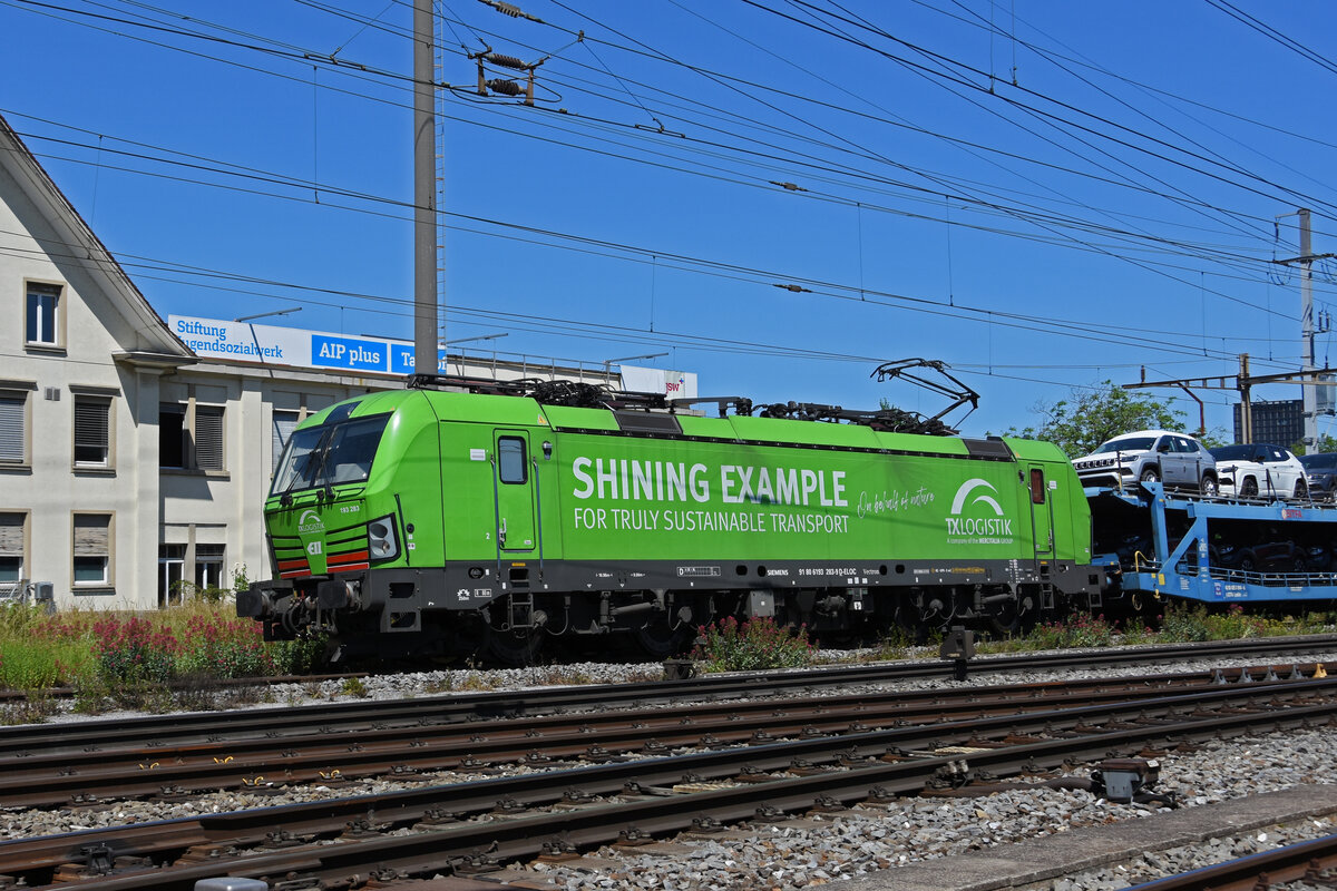 Widmer Rail Services AG (WRS). Holzzug mit der Ae 1042 007, ehemals ÖBB und der geschleppten Re 421 373, ehemals SBB in Huttwil am 25. Mai 2021. Fotostandort Strasse, Bildausschnitt Fotoshop. Foto: Walter Ruetsch