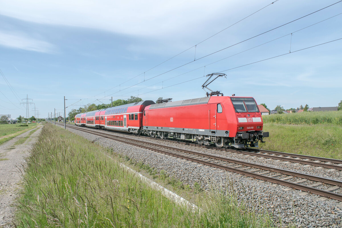 146 019-5 schiebt RE 30 in Richtung Halle/S. gesehen am 01.06.2021 bei Braschwitz.