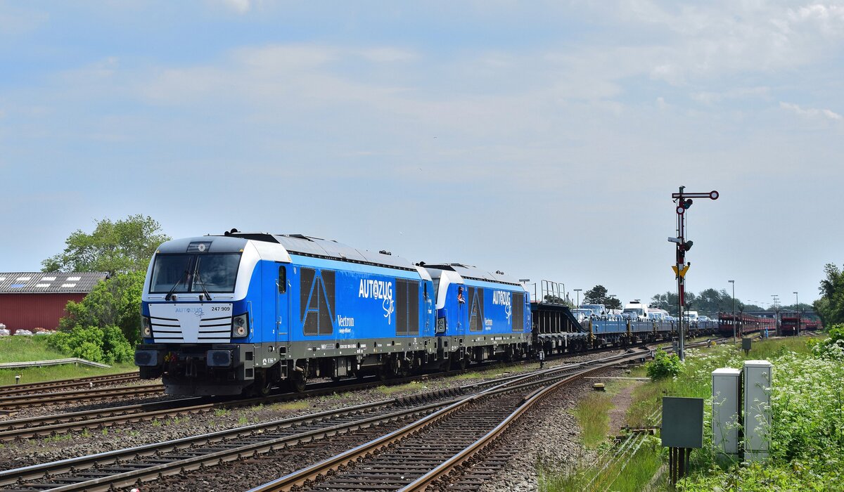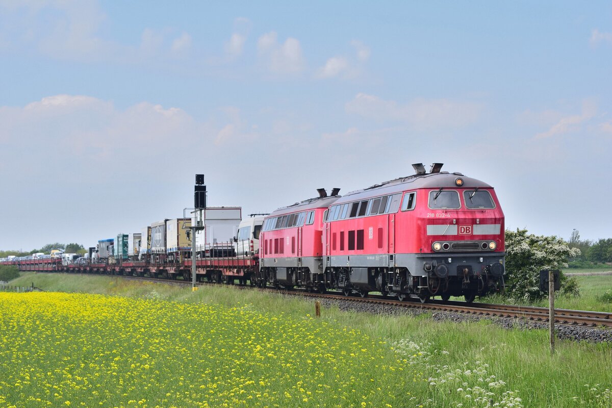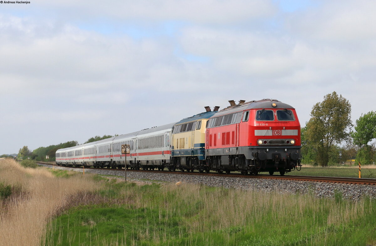 218 832-4 passiert mit einer weiteren 218 samt Autozug das Einfahrsignal Keitum auf den Weg nach Niebüll. Keitum 03.06.2021