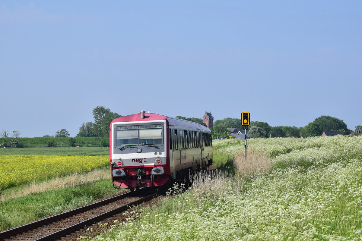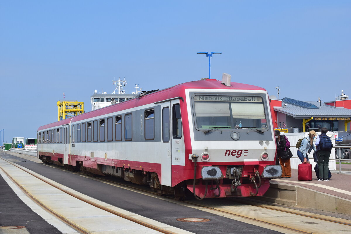 628 605 steht im Bahnhof Dagebüll Mole und nimmt Fahrgäste von den Inseln auf. Gut gefüllt ging es dann wieder nach Niebüll.