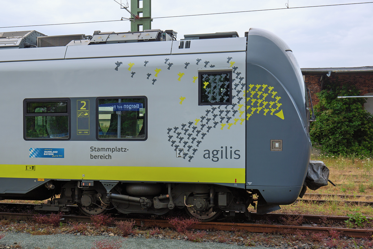 AGILIS Triebwagen und eine Schar kleiner Agilis Vögel als grosses Logo auf dem Fahrzeug. Die Reflexion im Seitenfenster verrät den Bahnhof Bergen. - 05.07.2021