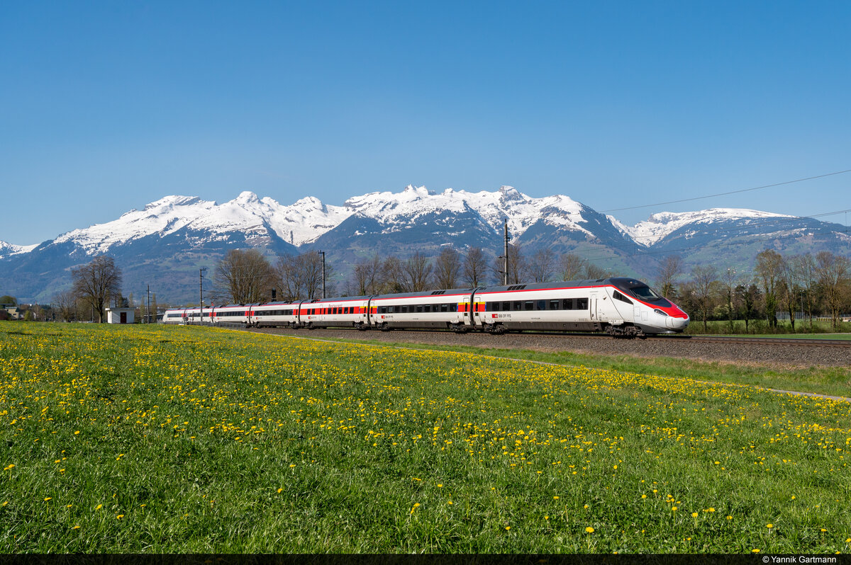 Am 24.04.2021 ist SBB ETR 610 006 mit dem EC 19793 von Zürich HB nach München Hbf, welcher aufgrund von Bauarbeiten über Liechtenstein/Feldkirch umgeleitet wurde. Der Zug konnte hier bei schönstem Wetter und toller Blumenwiese in Nendeln (Liechtenstein) aufgenommen werden.