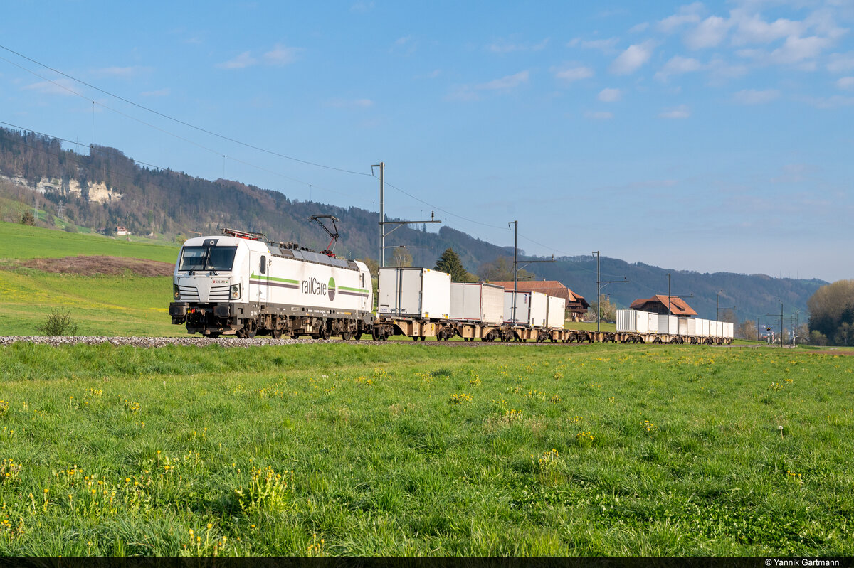 Am 27.04.2021 ist Railcare Rem 476 453-6 unterwegs mit dem Gürbetaler Güterzug von Niederbottigen nach Gwatt und konnte hier kurz nach Kaufdorf bei Kirchenthurnen aufgenommen werden.