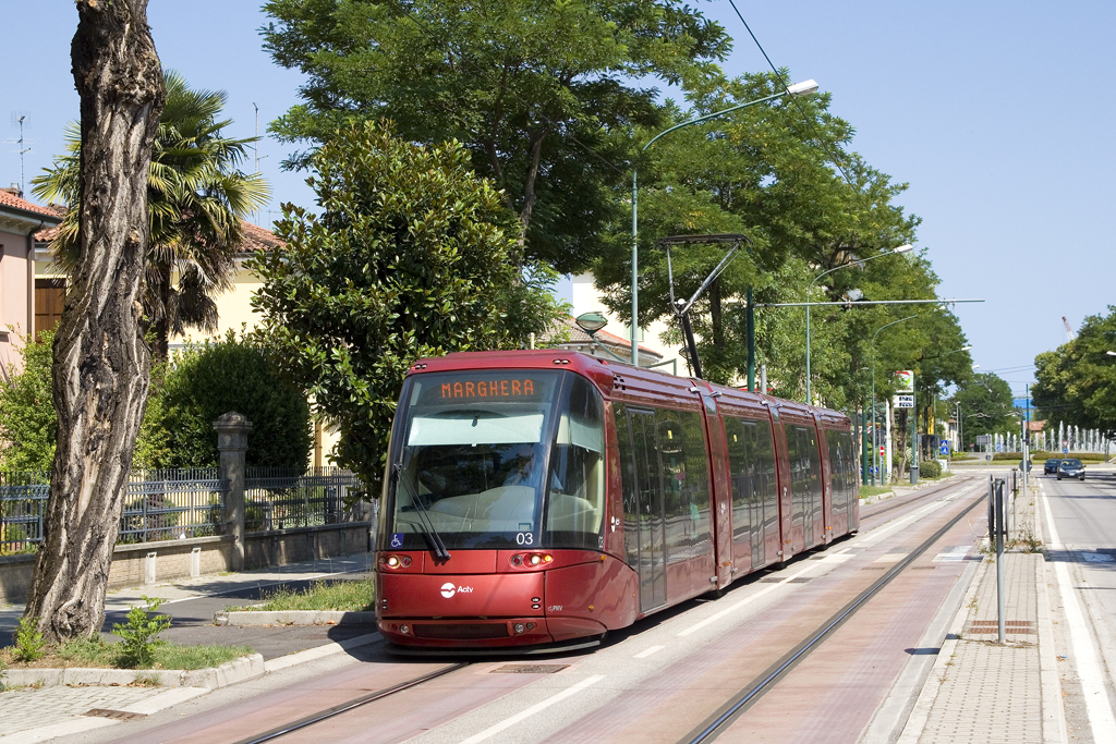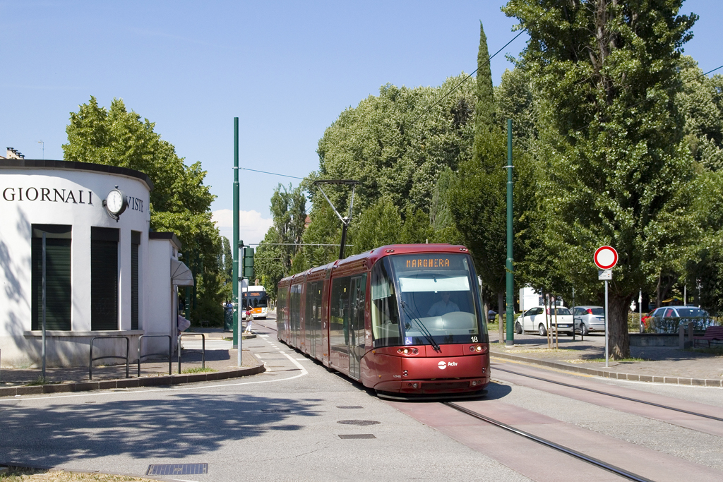 Am 5. Juli 2017 erreicht Translohr Wagen 19 als Linie T2 in Richtung Marghera soeben die Haltestelle Giovanacci.