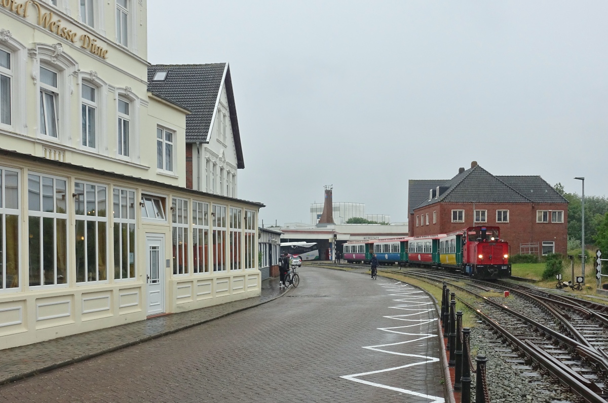 Vor dem Borkumer Kleinbahnhof wartet die  Hannover  am 28.06.2021 auf Fahrgäste in Richtung Reede