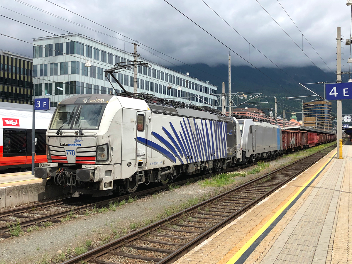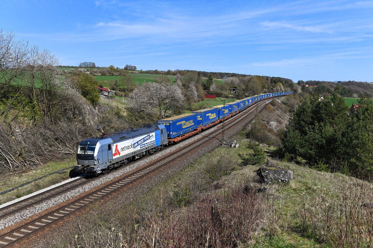Gerade einmal 50 Minuten nach der Abfahrt in das Zementwerk kehrt der ÖBB Vectron 1293 174 mit den 10 leeren Rocktainern in den Bahnhof Rohrdorf zurück. Die Waggons werden auf dem neben der Lokomotive sichtbaren Gleis abgestellt. Am linken Bildrand wartet der zweite Zugteil - ebenfalls 10 Rocktainer - darauf, über das in einer starken Steigung liegende Anschlußgleis in das Zementwerk gedrückt zu werden. Das Anschlußgleis existiert seit dem Jahr 1941. 6. Juli 2021