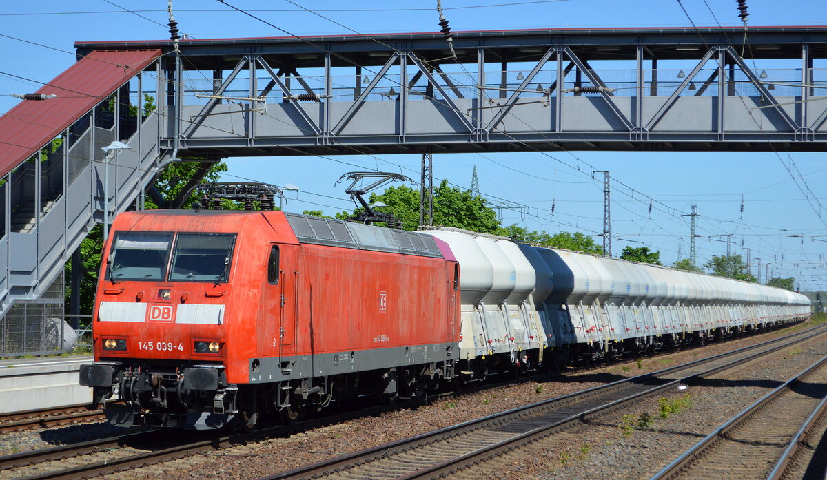 DB Cargo AG [D] mit  145 039-4  [NVR-Nummer: 91 80 6145 039-4 D-DB] und einem Ganzzug Zemenstaubwagen vom Logistiker Cemet S.A. am 31.05.21 Durchfahrt Bf. Saarmund.