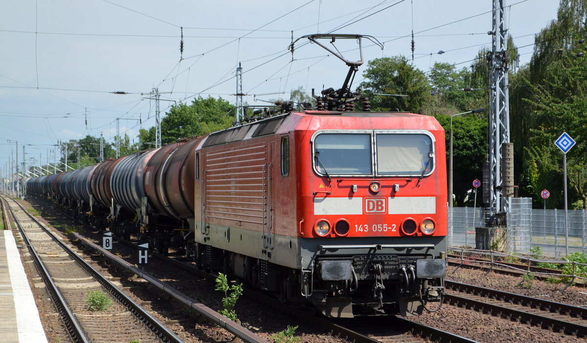 DeltaRail GmbH, Frankfurt (Oder) mit der angemieteten  143 055-2  (NVR-Nummer   91 80 6143 055-2 D-DB ) und Kesselwagenzug am 21.06.21 Berlin Hirschgarten.