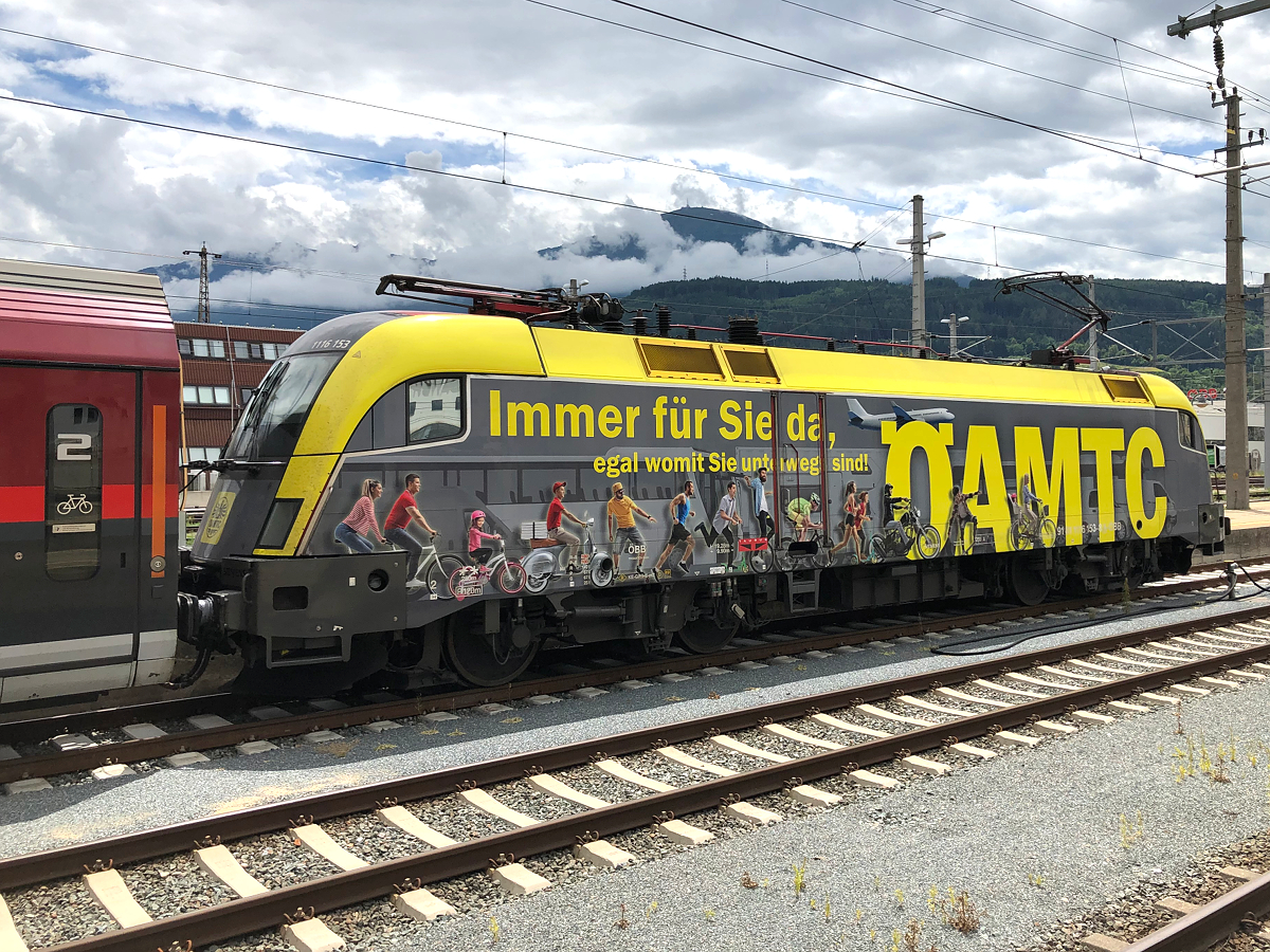 ÖBB Vectron 1293 174 rangiert im Bahnhof Rohrdorf. Es ist 10.15 Uhr des 6. Juli 2021. Der Vectron wird gleich an das nach Rosenheim zeigende Ende der ersten 10 Rocktainer kuppeln.